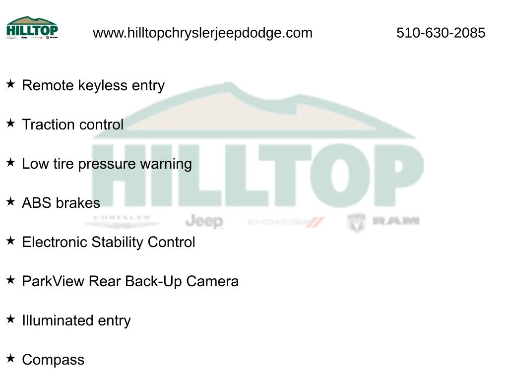 - Remote Keyless Entry, Traction Control, ABS Brakes, Low Tire Pressure Warning, and Electronic Stability Control