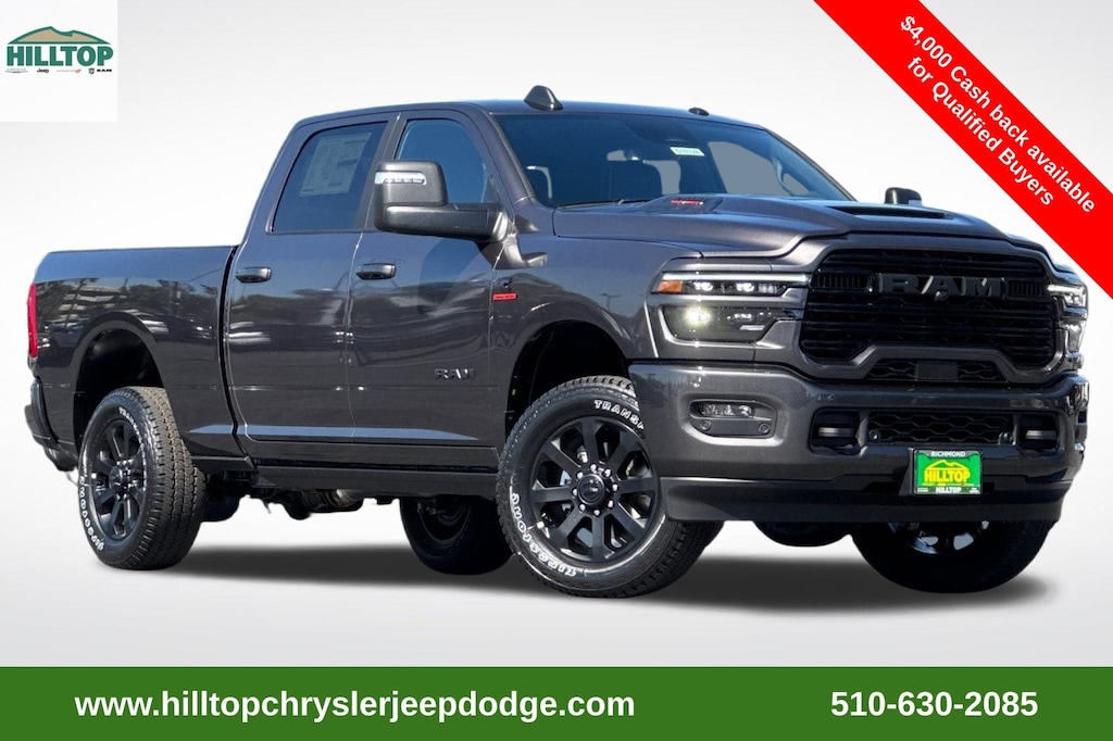 Granite Crystal Metallic Clearcoat 2025 Ram 2500 Laramie 4WD 8-Speed Automatic 6.7L I6 #1 Seat Foam Cushion, 10 Speakers, 115V Auxiliary Rear Power Outlet, 14.4" Touchscreen Display, 17 Speaker harman/kardon Premium Sound, 2 Way Rear Headrest Seat, 2nd Row In Floor Storage Bins, 4 Way Front Headrests, 4-Wheel Disc Brakes, 4G LTE Wi-Fi Hot Spot, ABS brakes, Active Lane Management System, Adaptive Steering System, Air Conditioning, Alexa Built-In, Alloy wheels, AM/FM radio: SiriusXM with 360L, Anti-Spin Differential Rear Axle, Apple CarPlay, Apple CarPlay/Android Auto, Auto Adjust In Reverse Exterior Mirrors, Auto Dim Exterior Mirror, Auto High Beam Headlamp Control, Auto Power-Folding Mirrors, Auto-Dimming Exterior Passenger Mirror, Auto-dimming Rear-View mirror, Automatic temperature control, Black Exterior Mirrors, Black Exterior Truck Badging, Black Wheel Center Hub, Body Color Grille Surround, Brake assist, Bucket Seats, Bumpers: body-color, Chrome Exterior Mirrors, Compass, Connected Travel & Traffic Services, Connectivity - US/Canada, CTR Stop Lamp w/Cargo View Camera, Dash Pass Thru Wire Circuits, Disassociated Touchscreen Display, Drowsy Driver Detection, Dual Wireless Charging Pad, Emergency Vehicle Alert System (EVAS), Exterior Mirrors Courtesy Lamps, Exterior Mirrors w/Heating Element, Exterior Mirrors w/Memory, Exterior Mirrors w/Supplemental Signals, Foam Bottle Insert (Door Trim Panel), Folding Flat Load Floor Storage, Forward & Reverse Utility Lights, Front dual zone A/C, Front Seat Back Map Pockets, Full Length Upgraded Floor Console, Global Telematics Box Module (TBM), Gloss Black Grille Billets/Accents, Google Android Auto, GPS Antenna Input, GPS Navigation, HD Radio, Heated Front Seats, Heated Steering Wheel, High Back Seats, Integrated Voice Command w/Bluetooth, Laramie Level 2 Plus Equipment Group, Leather Trimmed Bucket Seats, LED Bed Lighting, Mirror Running Lights, MOPAR Deployable Bed Step, MOPAR Spray In Bedliner, Navigation System, Night Edition, Off-Road Info Pages, ParkView Rear Back-Up Camera, Power 2-Way Driver Lumbar Adjust, Power 2-Way Passenger Lumbar Adjust, Power Adjust 8-Way Driver Seat, Power Adjust 8-Way Front Passenger Seat, Power Adjust Mirrors, Power Adjustable Convex Aux Mirrors, Power Adjustable Pedals w/Memory, Power Deployable Running Boards, Power driver seat, Power Heated Fold Telescopic Mirrors w/Memory, Power steering, Power Telescoping Mirrors, Power windows, Quick Order Package 24H Laramie, Radio data system, Radio: Uconnect 5 Nav w/12.0" Display, Radio: Uconnect 5 Nav w/14.4" Display, Rain Sensitive Windshield Wipers, Rear 60/40 Folding Seat, Rear window defroster, Remote keyless entry, Remote Tailgate Release, Selectable Tire Fill Alert, SiriusXM Radio Service, SiriusXM w/360L, Sport Performance Hood, Steering wheel mounted audio controls, Traction control, Traffic Sign Recognition, Trailer Tow Pages, Wheels: 20" x 8.0" Black Painted Aluminum. Price includes: $2000 - 2025 National Bonus Cash . Exp. 12/01/2025 $2000 - 2025 National Holiday Select Inventory Bonus Cash. Exp. 12/01/2025