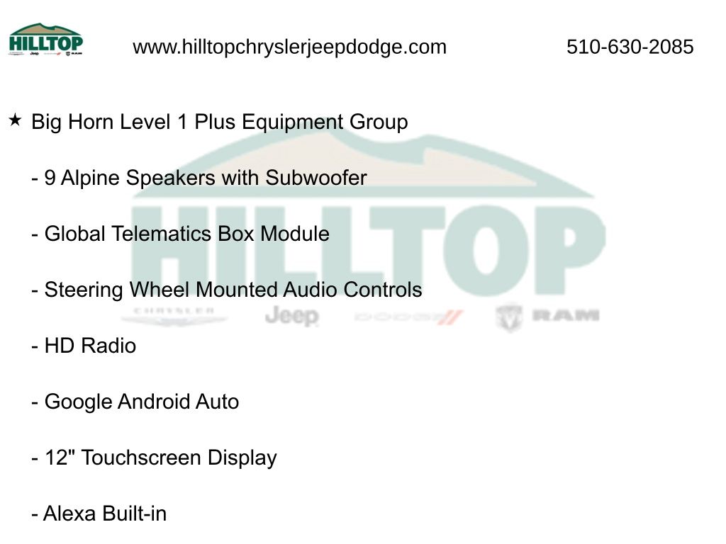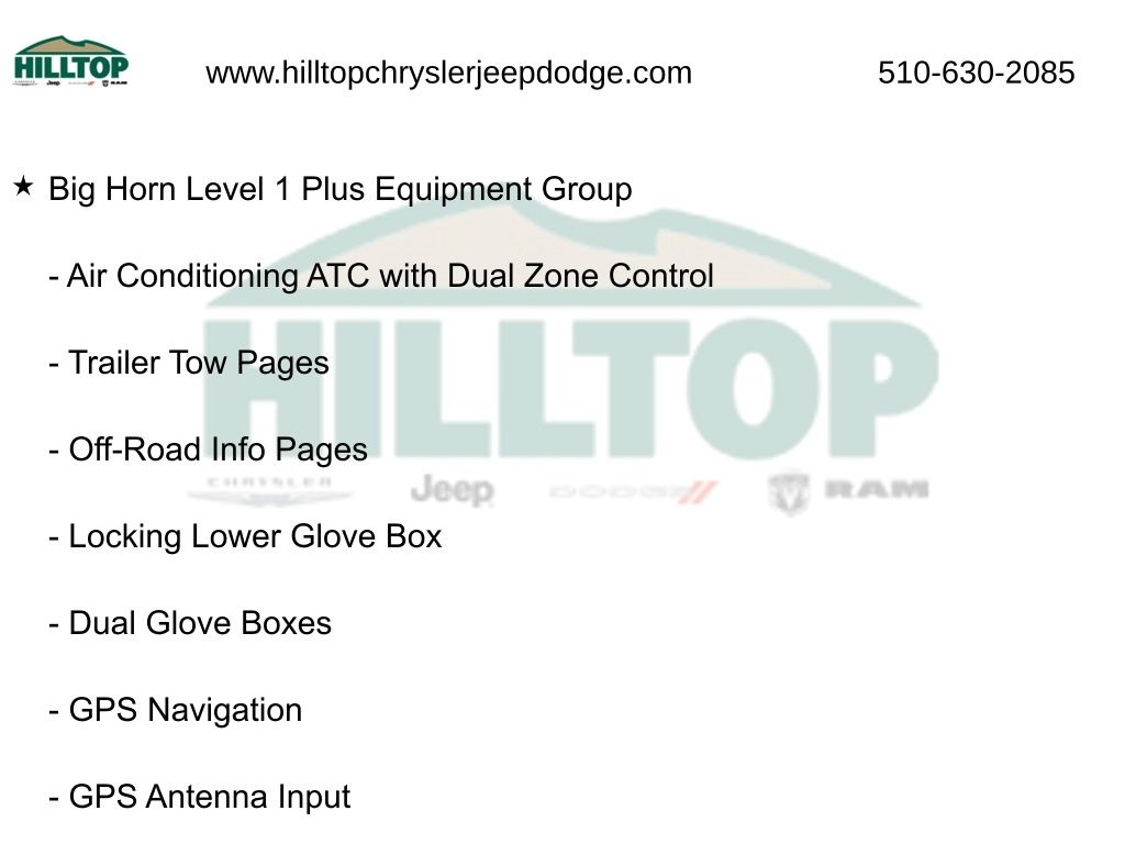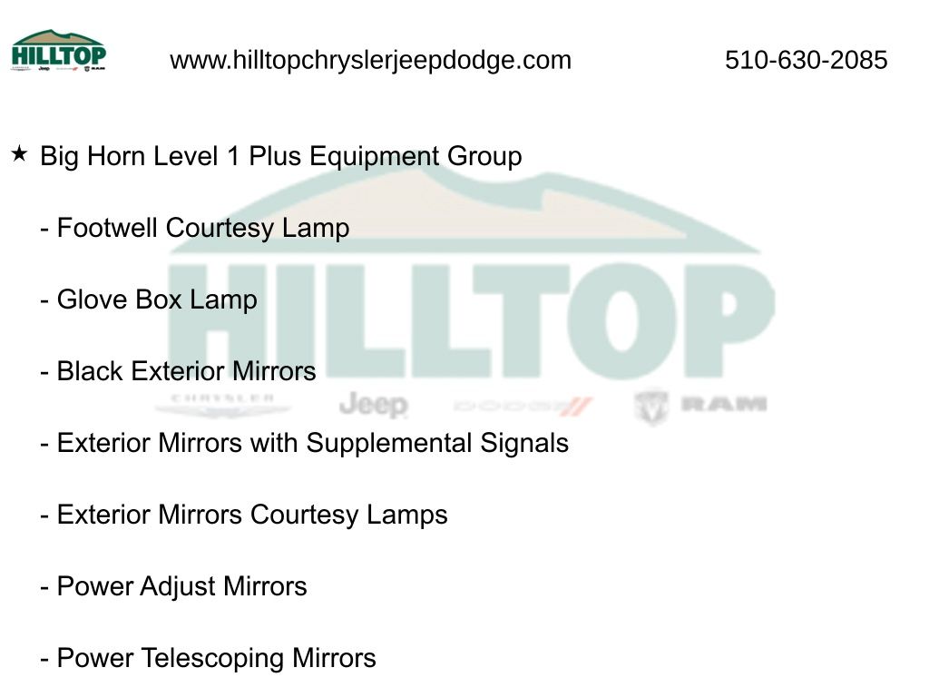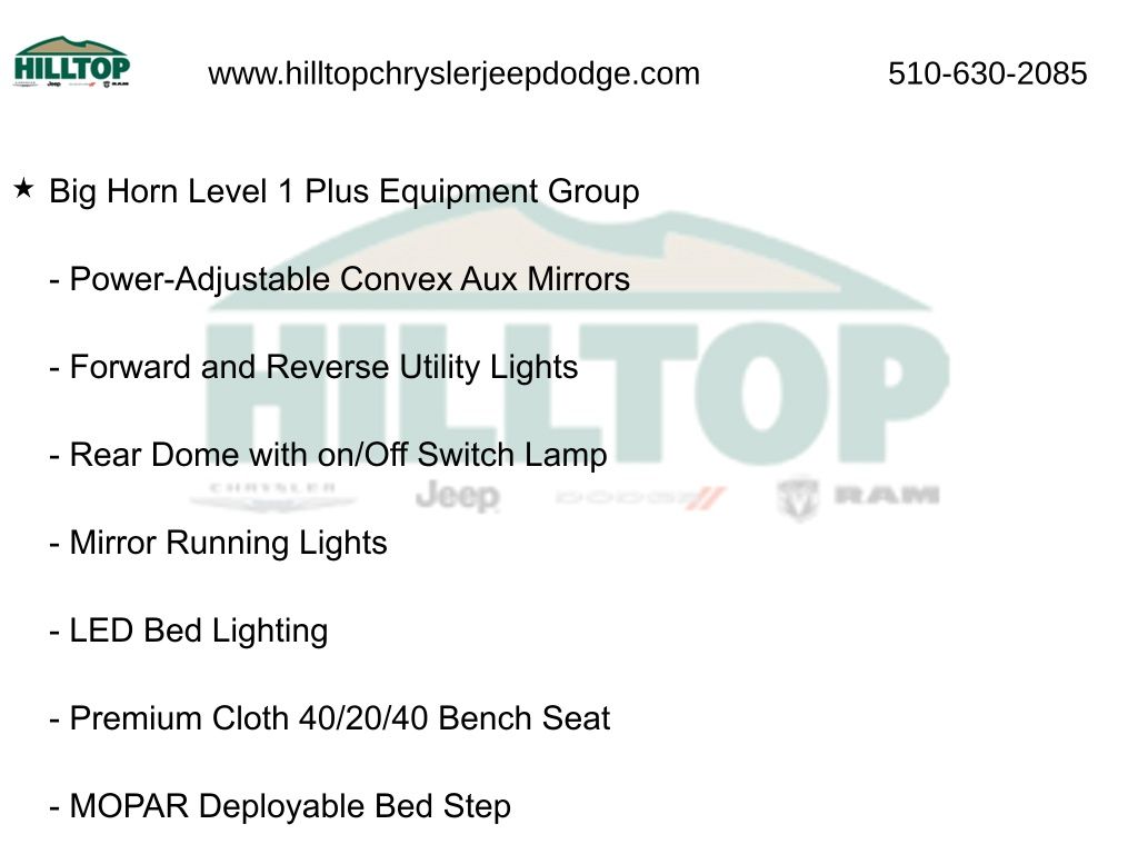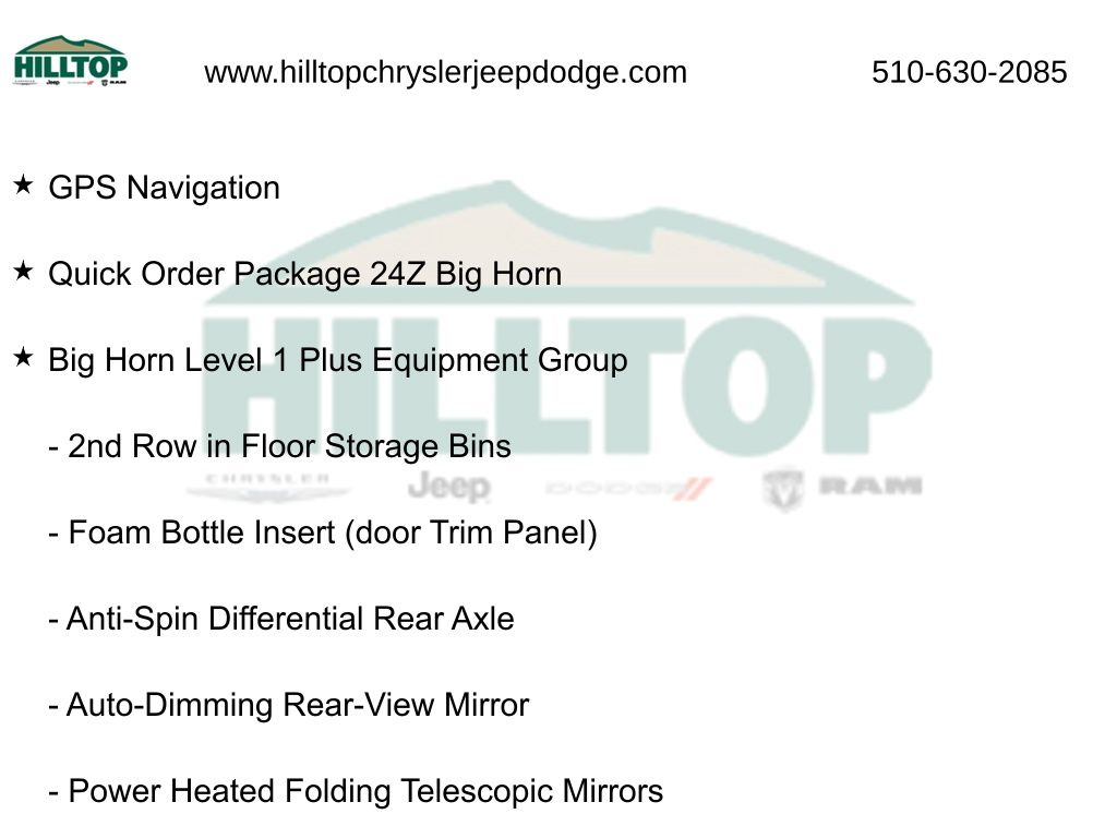 The Big Horn Level 1 Plus Equipment Group and Night Edition further enhance this truck's capabilities and style, providing a host of premium features and a bold, distinctive appearance. With the Quick Order Package 24Z Big Horn, you'll enjoy an exceptional level of convenience and customization.