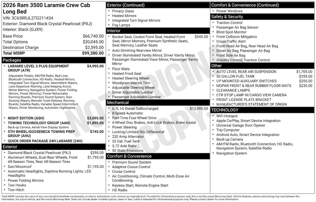Whether you're tackling rugged terrain, hauling heavy equipment, or simply enjoying the open road, the 2026 Ram 3500 Laramie is the ultimate companion. Experience the perfect blend of power, luxury, and technology that will elevate your driving experience to new heights. Schedule a test drive today and discover the true meaning of uncompromising capability. Price includes: $1000 - 2026 National Bonus Cash . Exp. 04/30/2026