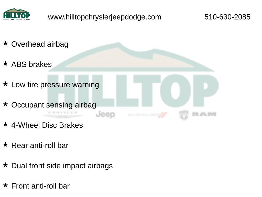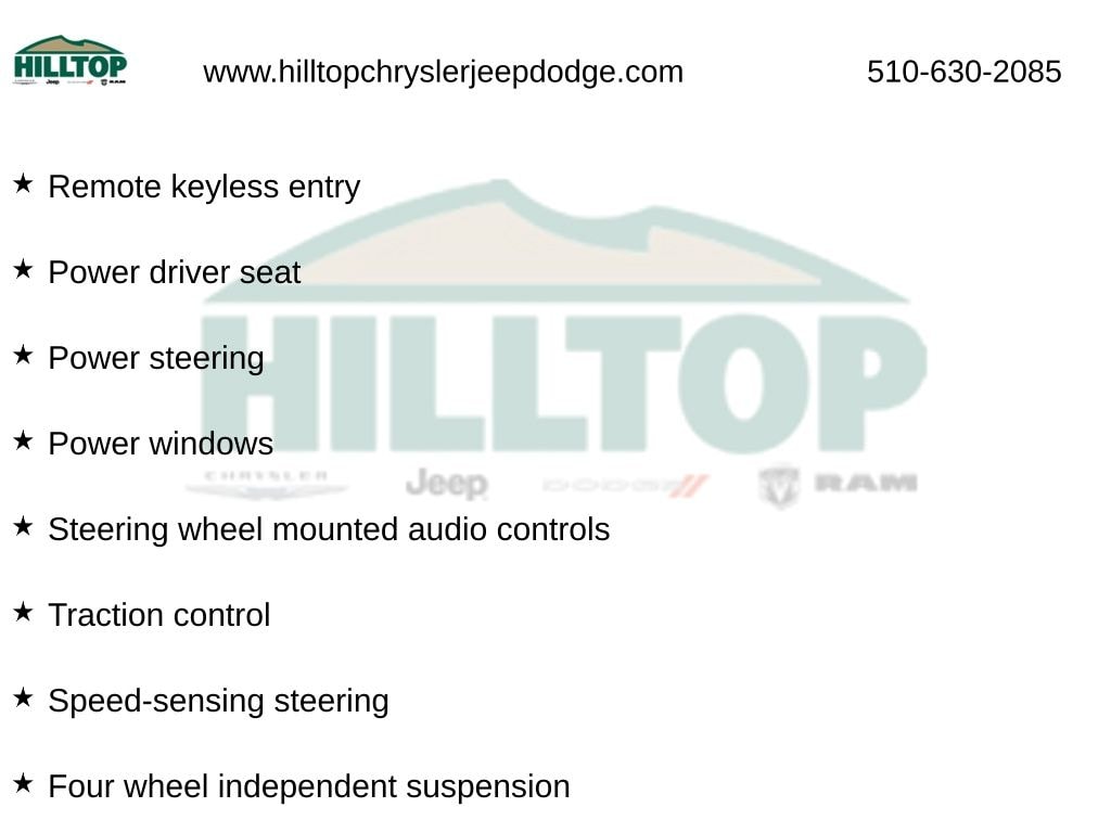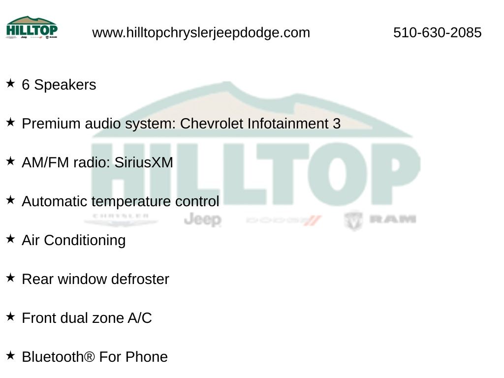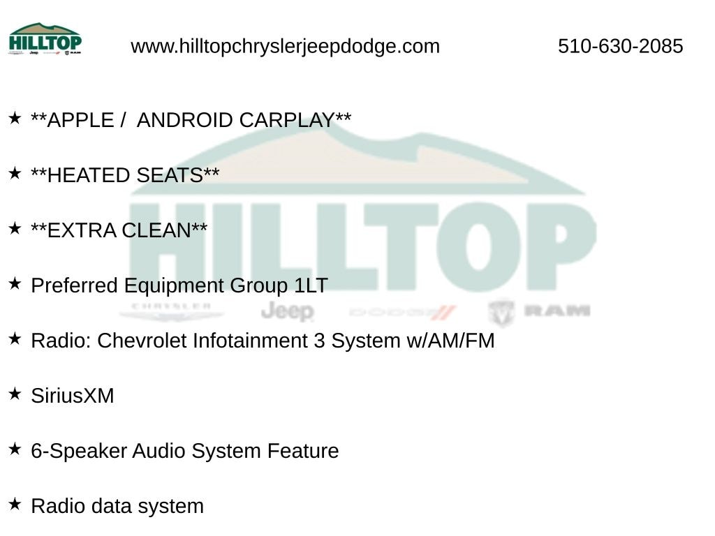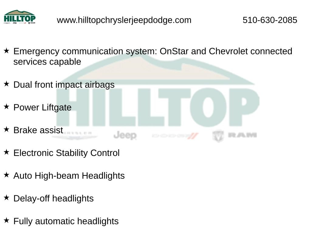 Hilltop CDJR makes buying or leasing your next car easy and enjoyable. Our CDJR finance team will spend time with you personally to discuss your preferences and budget, then help find loan rates that fit what you needâ"and negotiate the lease terms, too. We also offer extended warranty coverage and accessories that you can customize. We are your one-stop shop for buying or leasing cars in Richmond, CA. With our online car buying option you can browse the CDJR vehicles in stock, value your trade, apply for credit and estimate monthly payments all from your mobile deviceâ"or home computer. ****Vehicle Features May Include**** Preferred Equipment Group 1LT, 17" Aluminum Wheels, 2 Rear USB Charging-Only Ports, 2 USB Ports & Auxiliary Input Jack, 2-Way Power Driver Lumbar Control Seat Adjuster, 4-Wheel Disc Brakes, 6 Speakers, 6-Speaker Audio System Feature, ABS brakes, Air Conditioning, Alloy wheels, AM/FM radio: SiriusXM, Auto High-beam Headlights, Automatic temperature control, Bluetooth® For Phone, Brake assist, Bumpers: body-color, Compass, Delay-off headlights, Deleted 3 Years of OnStar Remote Access, Driver 8-Way Power Seat Adjuster, Driver door bin, Driver vanity mirror, Dual front impact airbags, Dual front side impact airbags, Electronic Stability Control, Emergency communication system: OnStar and Chevrolet connected services capable, Four wheel independent suspension, Front anti-roll bar, Front Bucket Seats, Front Center Armrest, Front dual zone A/C, Front reading lights, Fully automatic headlights, Heated door mirrors, Heated front seats, Illuminated entry, Low tire pressure warning, Occupant sensing airbag, Outside temperature display, Overhead airbag, Panic alarm, Passenger door bin, Power door mirrors, Power driver seat, Power Liftgate, Power steering, Power windows, Premium audio system: Chevrolet Infotainment 3, Radio data system, Radio: Chevrolet Infotainment 3 System w/AM/FM, Rear anti-roll bar, Rear reading lights, Rear window defroster, Remote keyless entry, Securit