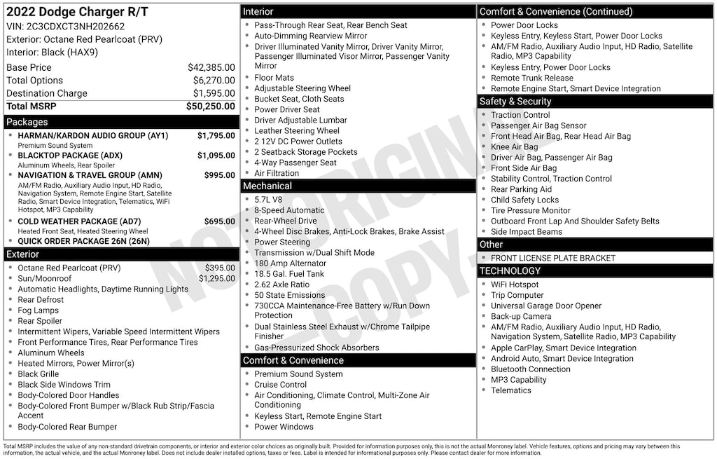 **ONE OWNER CARFAX**, **NO ACCIDENTS**, **EXTRA CLEAN**, 1-Yr SiriusXM Guardian Trial, 19 harman/kardon GreenEdge Speakers, 2-Piece Shark Fin Antenna, 4-Wheel Disc Brakes, 4G LTE Wi-Fi Hot Spot, 5-Year SiriusXM Traffic Service, 5-Year SiriusXM Travel Link Service, 6 Speakers, 8.4" Touchscreen Display, ABS brakes, Air Conditioning, Alloy wheels, AM/FM radio: SiriusXM, Anti-whiplash front head restraints, Apple CarPlay, Apple CarPlay/Android Auto, Auto-dimming Rear-View mirror, Automatic temperature control, Black 1-Piece Performance Spoiler, Black Dodge Grille Badge, Blacktop Package, Blacktop R/T Badge, Body Color Exterior Mirrors, Brake assist, Bumpers: body-color, Cloth Performance Seats, Cold Weather Package, Compass, Compass Gauge, Delay-off headlights, Driver door bin, Driver vanity mirror, Dual front impact airbags, Dual front side impact airbags, Electronic Stability Control, Emergency communication system: SiriusXM Guardian, For Details, Visit DriveUconnect.com, Four wheel independent suspension, Front anti-roll bar, Front Bucket Seats, Front Center Armrest, Front dual zone A/C, Front fog lights, Front License Plate Bracket, Front reading lights, Fully automatic headlights, Garage door transmitter: HomeLink, Gloss Black I/P Cluster Trim Rings, Google Android Auto, GPS Antenna Input, GPS Navigation, harman/kardon Audio Group, harman/kardon GreenEdge Amp, HD Radio, Heated door mirrors, Heated Front Seats, Heated Steering Wheel, HEMI Blacktop Fender Badge, Illuminated entry, Integrated Center Stack Radio, Integrated Voice Command w/Bluetooth, Knee airbag, Leather Shift Knob, Low tire pressure warning, Media Hub (2 USB, AUX), Navigation & Travel Group, Occupant sensing airbag, Outside temperature display, Overhead airbag, Overhead console, Panic alarm, ParkView Rear Back-Up Camera, Passenger door bin, Passenger vanity mirror, Power 2-Way Driver Lumbar Adjust, Power door mirrors, Power driver seat, Power steering, Power Sunroof, Power windows, Quick Order Package 26N, Radio: Uconnect 4C Nav w/8.4" Display, Radio: Uconnect 4C w/8.4" Display, Rear anti-roll bar, Rear reading lights, Rear seat center armrest, Rear window defroster, Remote keyless entry, Rhombi 2-Pc Wheel Center Cap, Satin Black Charger Decklid Badge, Satin Black Dodge Tail Lamp Badge, SiriusXM Traffic Plus, SiriusXM Travel Link, Speed control, Split folding rear seat, Spoiler, Sport steering wheel, Steering wheel mounted audio controls, Surround Sound, Tachometer, Telescoping steering wheel, Tilt steering wheel, Traction control, Trip computer, USB Host Flip, Wheels: 20" x 8" Black Noise Painted, Wheels: 20" x 8" Satin Carbon Aluminum.