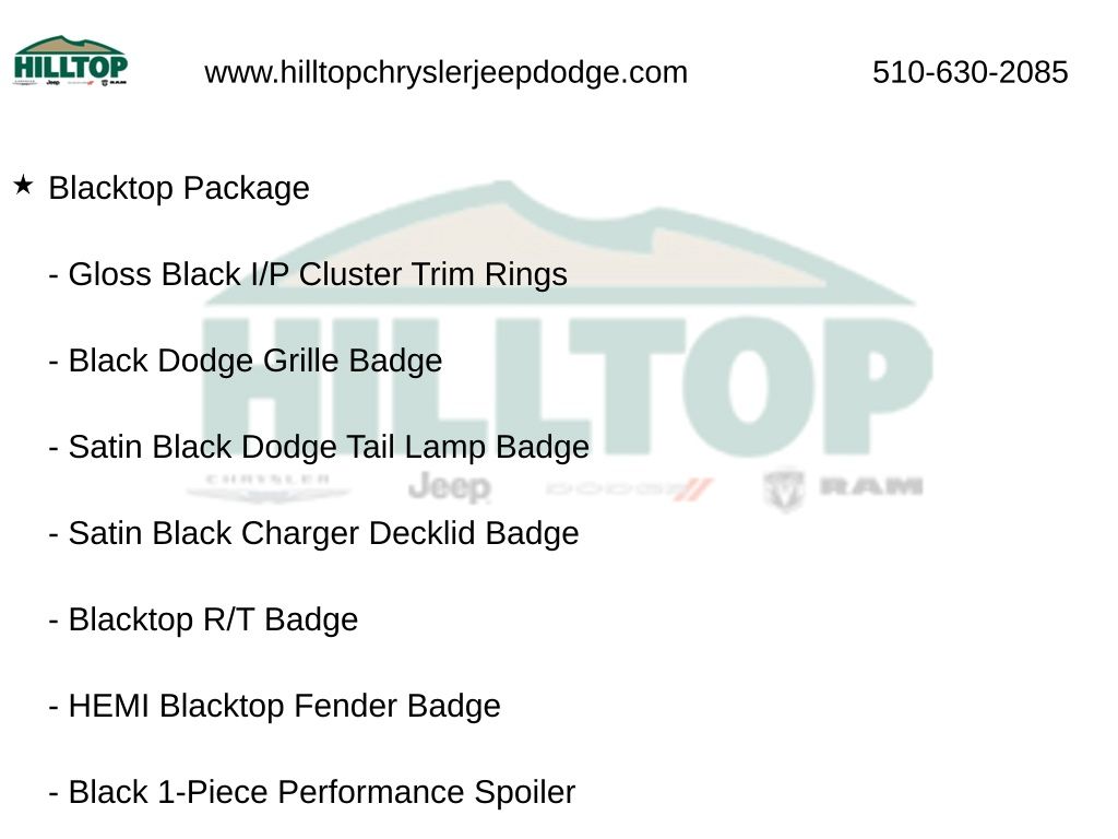Hilltop CDJR makes buying or leasing your next car easy and enjoyable. Our CDJR finance team will spend time with you personally to discuss your preferences and budget, then help find loan rates that fit what you needâ"and negotiate the lease terms, too. We also offer extended warranty coverage and accessories that you can customize. We are your one-stop shop for buying or leasing cars in Richmond, CA. With our online car buying option you can browse the CDJR vehicles in stock, value your trade, apply for credit and estimate monthly payments all from your mobile deviceâ"or home computer. ****Vehicle Features May Include**** Blacktop Package (Black 1-Piece Performance Spoiler, Black Dodge Grille Badge, Blacktop R/T Badge, Gloss Black I/P Cluster Trim Rings, HEMI Blacktop Fender Badge, Rhombi 2-Pc Wheel Center Cap, Satin Black Charger Decklid Badge, Satin Black Dodge Tail Lamp Badge, and Wheels: 20" x 8" Black Noise Painted), Cold Weather Package (Heated Front Seats and Heated Steering Wheel), harman/kardon Audio Group (19 harman/kard