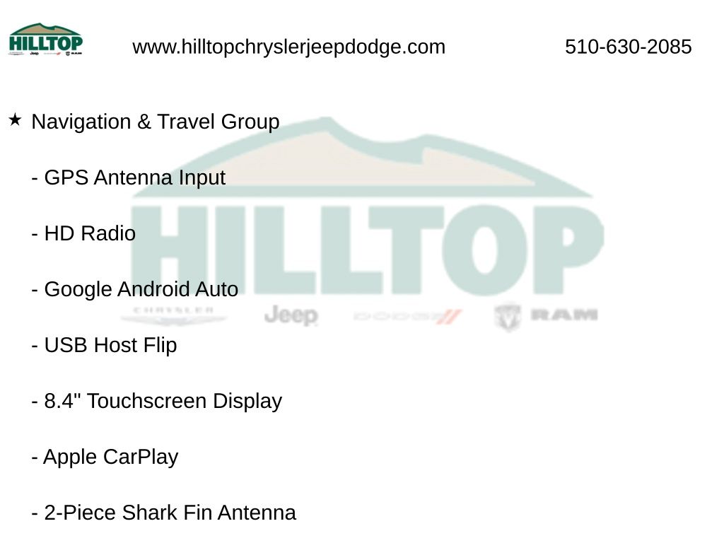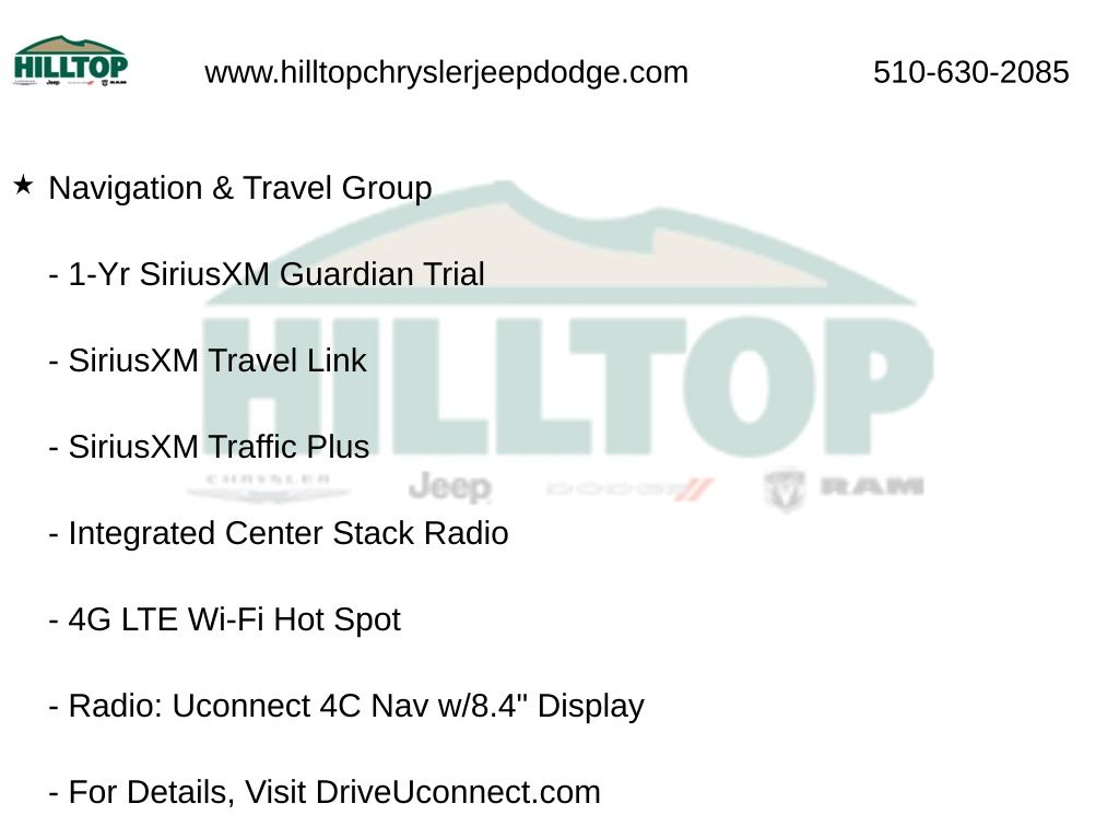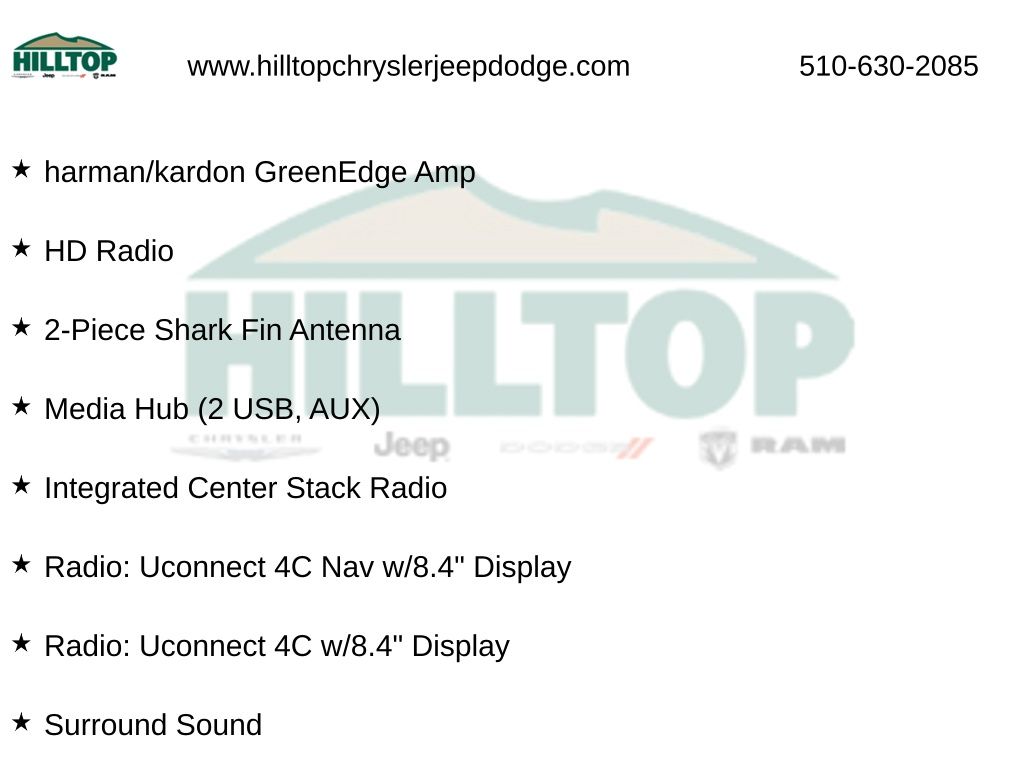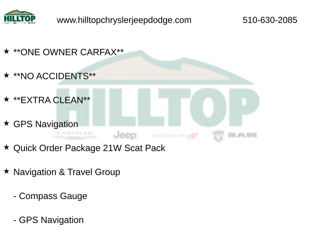 Hilltop CDJR makes buying or leasing your next car easy and enjoyable. Our CDJR finance team will spend time with you personally to discuss your preferences and budget, then help find loan rates that fit what you needâ"and negotiate the lease terms, too. We also offer extended warranty coverage and accessories that you can customize. We are your one-stop shop for buying or leasing cars in Richmond, CA. With our online car buying option you can browse the CDJR vehicles in stock, value your trade, apply for credit and estimate monthly payments all from your mobile deviceâ"or home computer. ****Vehicle Features May Include**** harman/kardon Audio Group (19 harman/kardon GreenEdge Speakers, harman/kardon GreenEdge Amp, and Surround Sound), Navigation & Travel Group (1-Yr SiriusXM Guardian Trial, 2-Piece Shark Fin Antenna, 4G LTE Wi-Fi Hot Spot, 5-Year SiriusXM Traffic Service, 5-Year SiriusXM Travel Link Service, 8.4" Touchscreen Display, Apple CarPlay, Compass Gauge, For Details, Visit DriveUconnect.com, Google Android Auto, GPS Antenna Input, GPS Navigation, HD Radio, Integrated Center Stack Radio, Integrated Voice Command w/Bluetooth, Media Hub (2 USB, AUX), Radio: Uconnect 4C Nav w/8.4" Display, SiriusXM Traffic Plus, SiriusXM Travel Link, and USB Host Flip), Quick Order Package 21W Scat Pack, 4-Wheel Disc Brakes, 6 Speakers, ABS brakes, Air Conditioning, AM/FM radio: SiriusXM, Anti-whiplash front head restraints, Apple CarPlay/Android Auto, Auto-dimming Rear-View mirror, Automatic temperature co