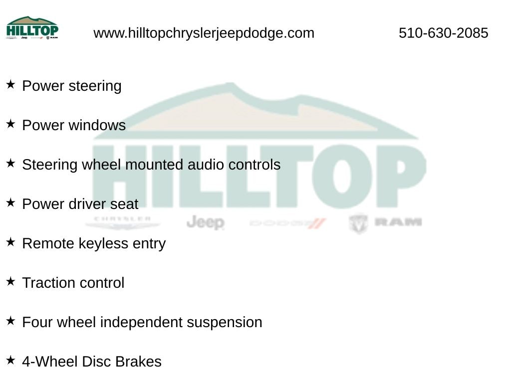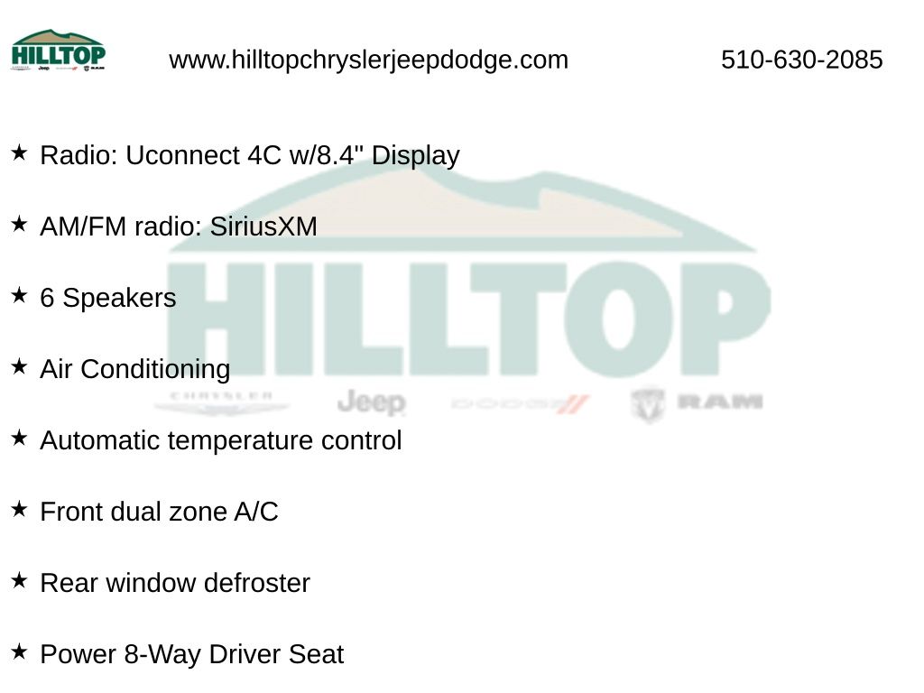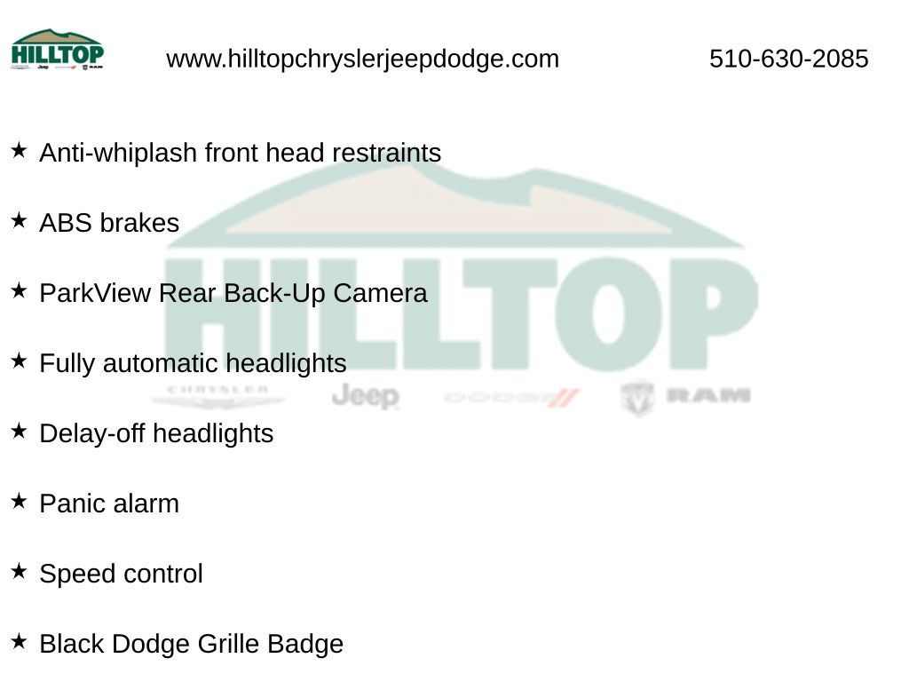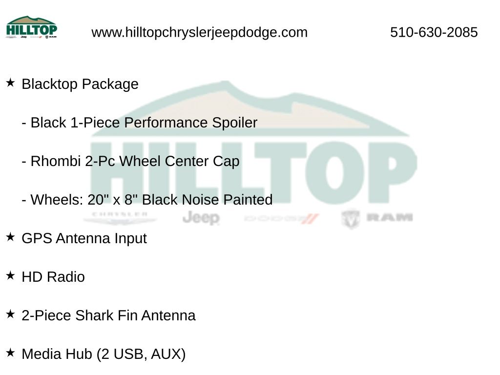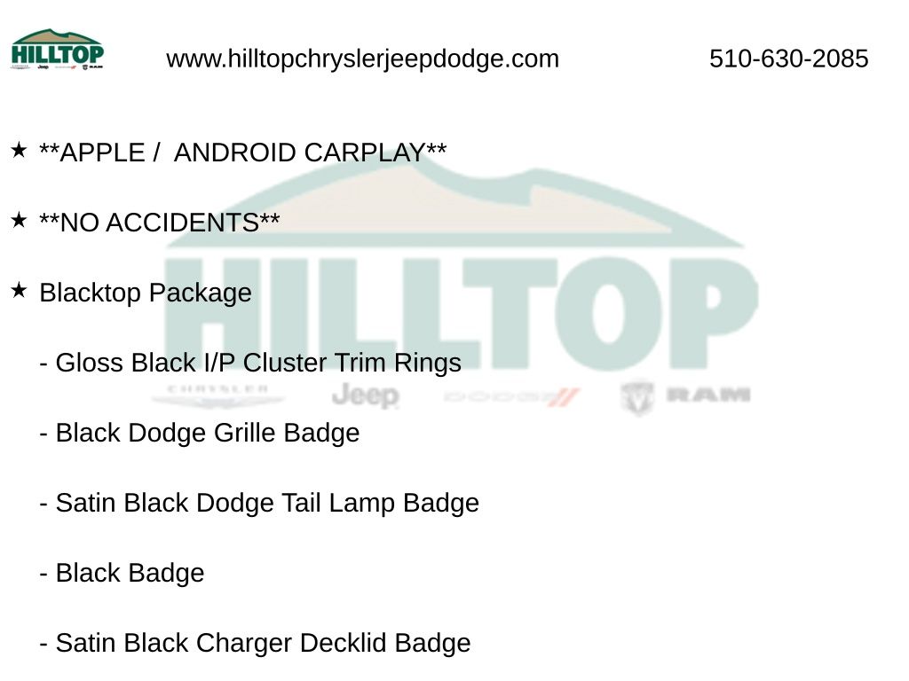 Hilltop CDJR makes buying or leasing your next car easy and enjoyable. Our CDJR finance team will spend time with you personally to discuss your preferences and budget, then help find loan rates that fit what you needâ"and negotiate the lease terms, too. We also offer extended warranty coverage and accessories that you can customize. We are your one-stop shop for buying or leasing cars in Richmond, CA. With our online car buying option you can browse the CDJR vehicles in stock, value your trade, apply for credit and estimate monthly payments all from your mobile deviceâ"or home computer. ****Vehicle Features May Include**** Blacktop Package (Black 1-Piece Performance Spoiler, Black Badge, Black Dodge Grille Badge, Gloss Black I/P Cluster Trim Rings, Rhombi 2-Pc Wheel Center Cap, Satin Black Charger Decklid Badge, Satin Black Dodge Tail Lamp Badge, and Wheels: 20" x 8" Black Noise Painted), 1-Yr SiriusXM Guardian Trial, 2-Piece Shark Fin Antenna, 4-Wheel Disc Brakes, 4G LTE Wi-Fi Hot Spot, 6 Speakers, 8.4" Touchscreen Display, ABS brakes, Air Conditioning, Alloy wheels, AM/FM radio: SiriusXM, Anti-whiplash front head restraints, Apple CarPlay, Apple CarPlay/Android Auto, Auto-dimming Rear-View mirror, Automatic temperature control, Bumpers: body-color, Cloth Performance Seats, Compass, Compass Gauge, Delay-off headlights, Driver door bin, Driver vanity mirror, Exterior Mirrors w/Heating Element, For Details, Visit DriveUconnect.com, Four wheel independent suspension, Front Bucket Seats, Front Center Armrest, Front dual zone A/C, Front License Plate Bracket, Front reading lights, Fully automatic headlights, Garage door transmitter: HomeLink, Google Android Auto, GPS Antenna Input, HD Radio, Heated door mirrors, Illuminated entry, Integrated Center Stack Radio, Integrated Voice Command w/Bluetooth, Leather Shift Knob, Manufacturer's Statement of Origin, Media Hub (2 USB, AUX), Outside temperature display, Over