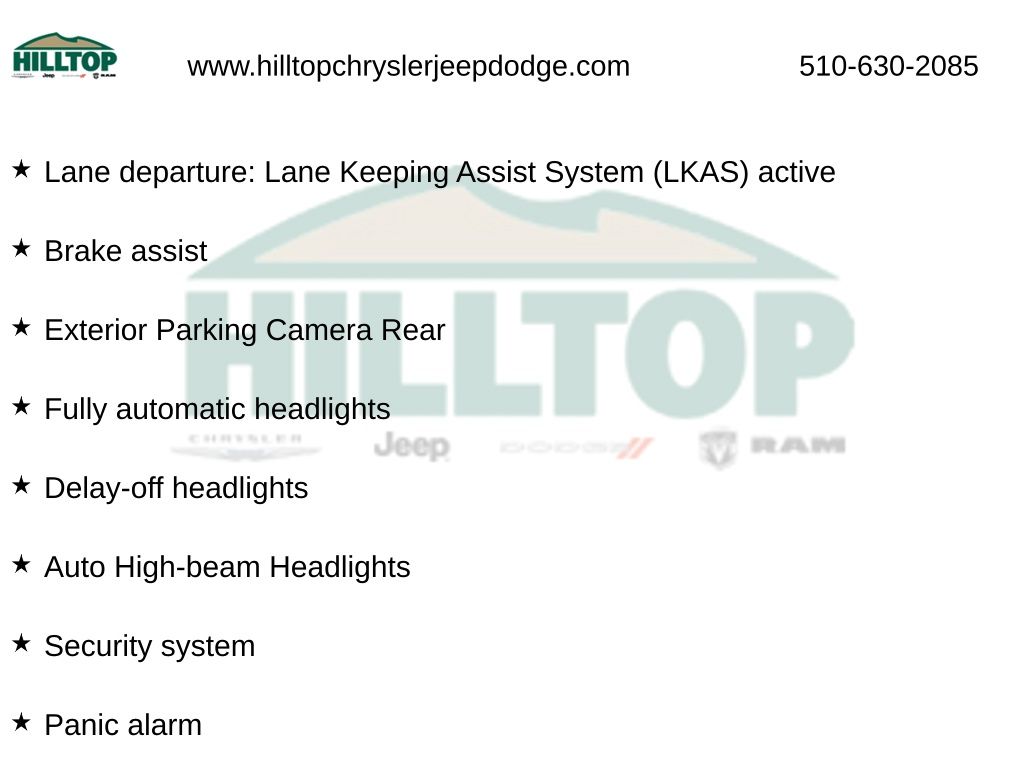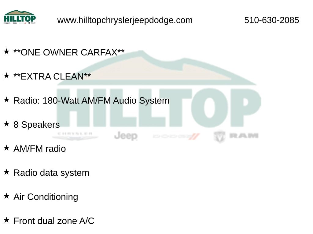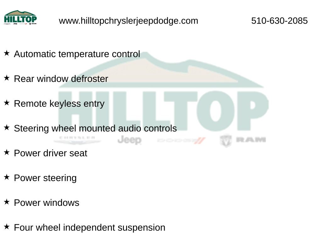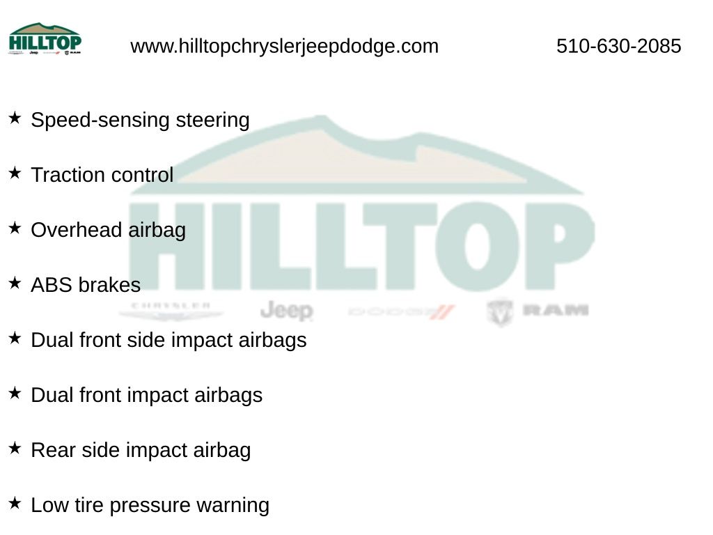 Hilltop CDJR makes buying or leasing your next car easy and enjoyable. Our CDJR finance team will spend time with you personally to discuss your preferences and budget, then help find loan rates that fit what you needâ"and negotiate the lease terms, too. We also offer extended warranty coverage and accessories that you can customize. We are your one-stop shop for buying or leasing cars in Richmond, CA. With our online car buying option you can browse the CDJR vehicles in stock, value your trade, apply for credit and estimate monthly payments all from your mobile deviceâ"or home computer. ****Vehicle Features May Include**** 4-Wheel Disc Brakes, 8 Speakers, ABS brakes, Adaptive Cruise Control: Adaptive Cruise Control (ACC) with Low-Speed Follow, Air Conditioning, Alloy wheels, AM/FM radio, Apple CarPlay/Android Auto, Auto High-beam Headlights, Auto-dimming Rear-View mirror, Automatic temperature control, Brake assist, Bumpers: body-color, Delay-off headlights, Driver door bin, Driver vanity mirror, Dual front impact airbags, Dual front side impact airbags, Electronic Stability Control, Emergency communication system: HondaLink Assist, Exterior Parking Camera Rear, Fabric Seat Trim, Four wheel independent suspension, Front anti-roll bar, Front Bucket Seats, Front Center Armrest, Front dual zone A/C, Front reading lights, Fully automatic headlights, Heated door mirrors, Heated Front Bucket Seats, Heated front seats, Illuminated entry, Knee airbag, Lane departure: Lane Keeping Assist System (LKAS) active, Low tire pressure warning, Occupant sensing airbag, Outside temperature display, Overhead airbag, Overhead console, Panic alarm, Passenger door bin, Passenger vanity mirror, Power door mirrors, Power driver seat, Power moonroof, Power steering, Power windows, Radio data system, Radio: 180-Watt AM/FM Audio System, Rear anti-roll bar, Rear reading lights, Rear seat center armrest, Rear side impact airbag, Rear window defroster, Remote keyless entry, Security system, Speed control, Speed-sensi