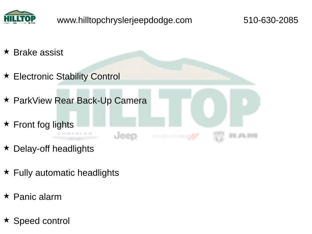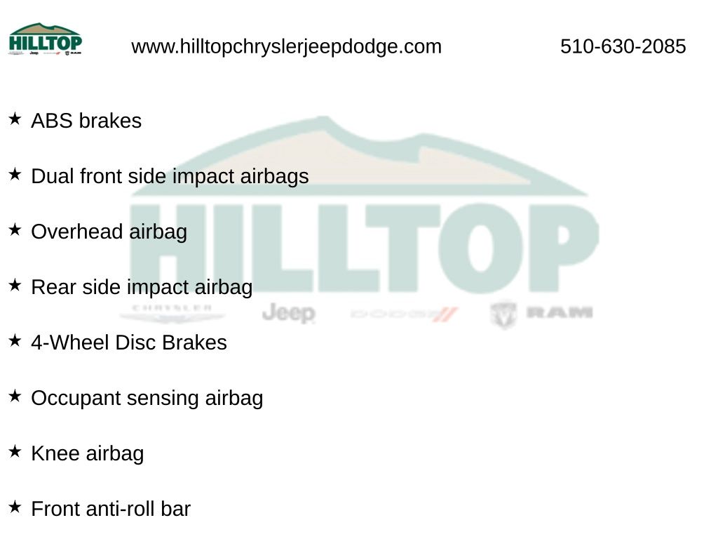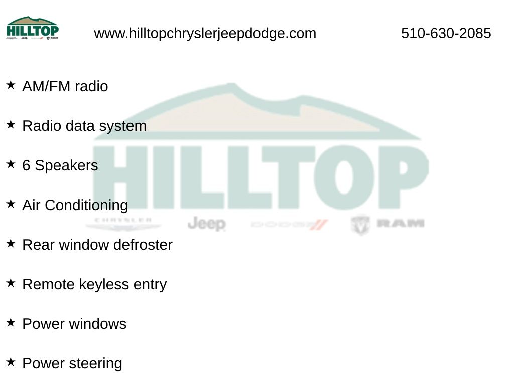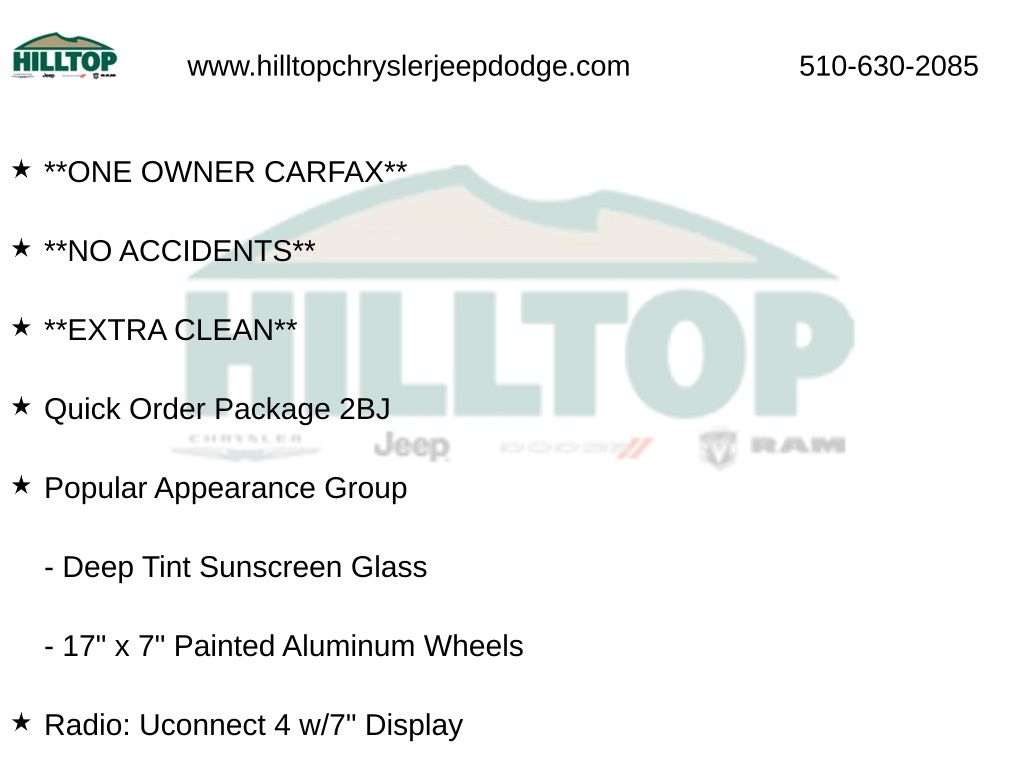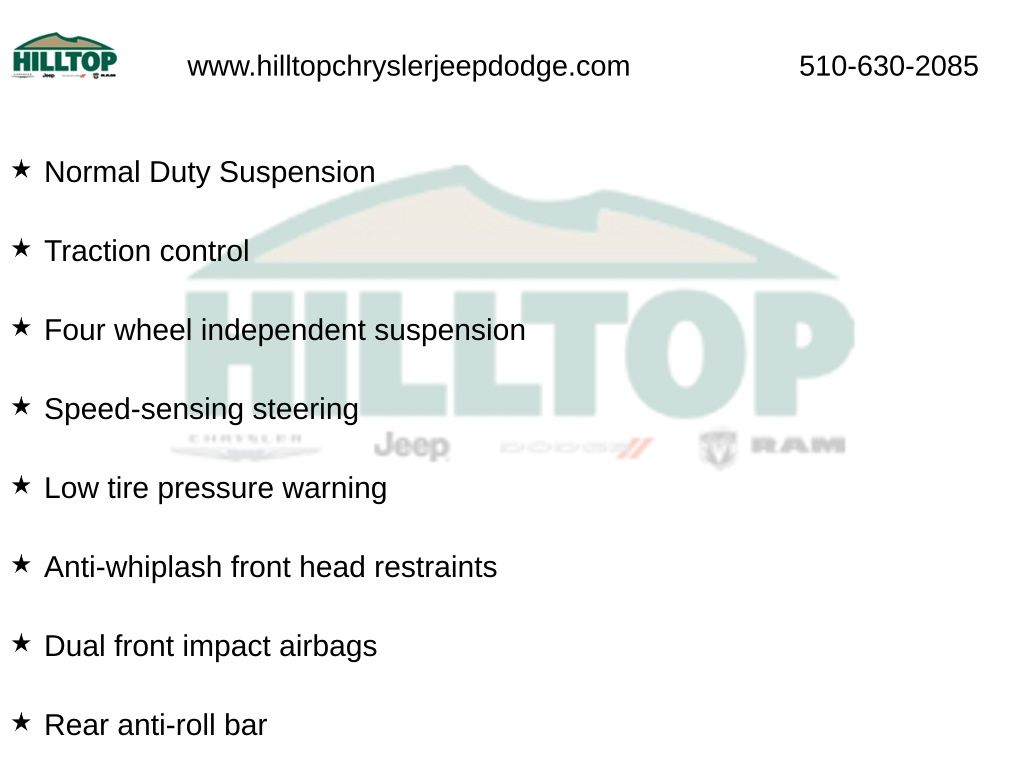 Hilltop CDJR makes buying or leasing your next car easy and enjoyable. Our CDJR finance team will spend time with you personally to discuss your preferences and budget, then help find loan rates that fit what you needâ"and negotiate the lease terms, too. We also offer extended warranty coverage and accessories that you can customize. We are your one-stop shop for buying or leasing cars in Richmond, CA. With our online car buying option you can browse the CDJR vehicles in stock, value your trade, apply for credit and estimate monthly payments all from your mobile deviceâ"or home computer. ****Vehicle Features May Include**** Popular Appearance Group (17" x 7" Painted Aluminum Wheels and Deep Tint Sunscreen Glass), Quick Order Package 2BJ, 4-Wheel Disc Brakes, 6 Speakers, ABS brakes, Air Conditioning, AM/FM radio, Anti-whiplash front head restraints, Apple CarPlay/Android Auto, Brake assist, Bumpers: body-color, Compass, Delay-off headlights, Driver door bin, Driver vanity mirror, Dual front impact airbags, Dual front side impact airbags, Electronic Stability Control, Four wheel independent suspension, Front anti-roll bar, Front fog lights, Front reading lights, Fully automatic headlights, Heated door mirrors, Illuminated entry, Knee airbag, Low tire pressure warning, Normal Duty Suspension, Occupant sensing airbag, Outside temperature display, Overhead airbag, Overhead console, Panic alarm, ParkView Rear Back-Up Camera, Passenger vanity mirror, Power door mirrors, Power steering, Power windows, Radio data system, Radio: Uconnect 4 w/7" Display, Rear anti-roll bar, Rear reading lights, Rear side impact airbag, Rear window defroster, Remote keyless entry, Roof rack: rails only, Speed control, Speed-sensing steering, Spoiler, Stop-Start Multiple VSM System, Traction control, 3.734 Axle Ratio, Cloth Bucket Seats, Front Bucket Seats, Front Center Armrest, Passenger door bin, Rear seat center armrest, Rear window wiper, Split folding rear seat, Tachometer, Telescoping steering wheel, Tilt steering wheel, Trip computer, Variably intermittent wipers, and Voltmeter.
