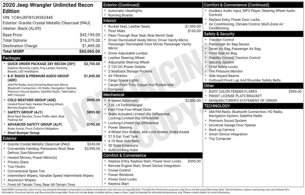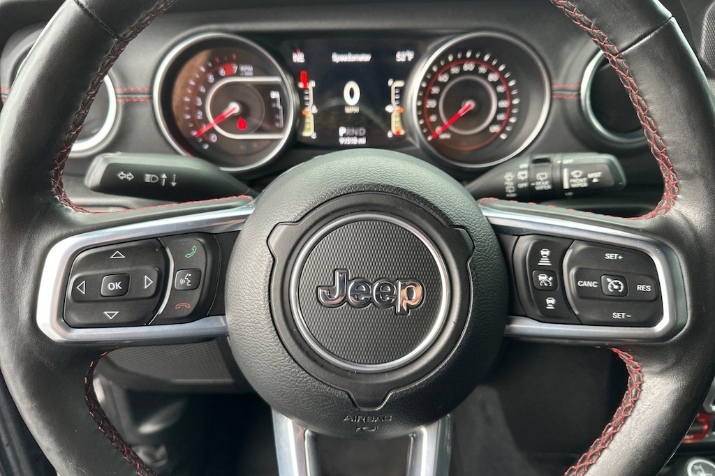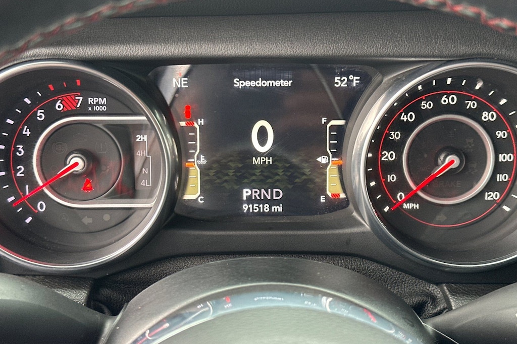 **APPLE / ANDROID CARPLAY**, **ONE OWNER CARFAX**, **EXTRA CLEAN**, 1-Year SiriusXM Guardian Trial, 4-Wheel Disc Brakes, 4G LTE Wi-Fi Hot Spot, 5-Year SiriusXM Traffic Service, 5-Year SiriusXM Travel Link Service, 8 Speakers, 8.4" Radio & Premium Audio Group, 8.4" Touchscreen Display, ABS brakes, Advanced Brake Assist, Advanced Safety Group, Air Conditioning, Alloy wheels, Alpine Premium Audio System, AM/FM radio: SiriusXM, Apple CarPlay/Android Auto, Auto-Dimming Rear-View Mirror, Automatic temperature control, Aux Battery, BF Goodrich Brand Tires, Black/Body Color Grille, Blind Spot & Cross Path Detection, Body Color Fender Flares, Brake assist, Cold Weather Group, Compass, Daytime Running Lamps LED Accents, Delay-off headlights, Driver door bin, Driver vanity mirror, Electronic Stability Control, Emergency/Assistance Call, For Details, Visit DriveUconnect.com, Front Bucket Seats, Front dual zone A/C, Front fog lights, Front LED Fog Lamps, Front License Plate Bracket, Full Speed Forward Collision Warning Plus, Fully automatic headlights, GPS Navigation, HD Radio, Heated door mirrors, Heated Front Seats, Heated Steering Wheel, Jeep Trail Rated Kit, Leather steering wheel, LED Lighting Group, LED Reflector Headlamps, LED Taillamps, MOPAR Bumper Hoop, MOPAR Hinge-Gate Reinforcement, Non-Lock Fuel Cap w/o Discriminator, ParkSense Rear Park Assist System, ParkView Rear Back-Up Camera, Performance Suspension, Power door mirrors, Power steering, Power Top Quarter Window Storage Bag, Power windows, Quick Order Package 28Y Recon, Radio data system, Radio: Uconnect 4 w/7" Display, Radio: Uconnect 4C Nav w/8.4" Display, Rear Window Defroster, Rear Window Wiper/Washer, Recon Badge, Recon Decals, Recon Package, Red Seat Belts, Remote keyless entry, Removable Rear Quarter Windows, Safety Group, SiriusXM Traffic Plus, SiriusXM Travel Link, Sky 1-Touch Power Top, Steel Bumper Group, Steel Front Bumper, Steel Rear Bumper, Steering wheel mounted audio controls, Stop-Start Dual Battery System, Traction control, Wheels: 17" x 7.5" Machined w/Black Pockets, Wheels: 17" x 7.5" Machined/Painted Black, Wrapped I/P Bezels w/Red Stitch.