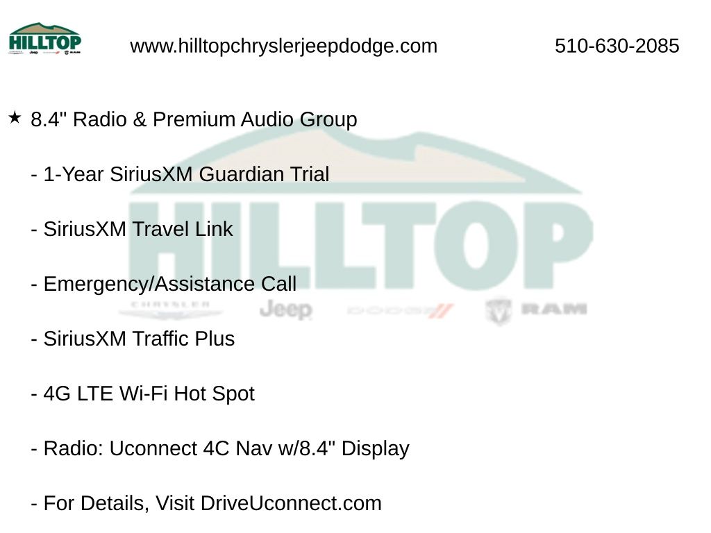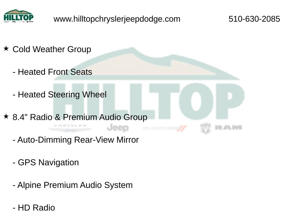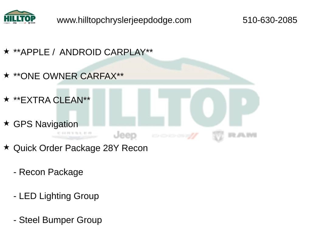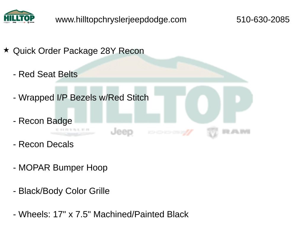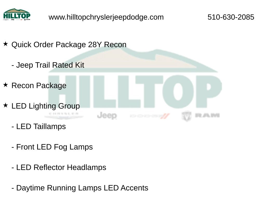 Hilltop CDJR makes buying or leasing your next car easy and enjoyable. Our CDJR finance team will spend time with you personally to discuss your preferences and budget, then help find loan rates that fit what you needâ"and negotiate the lease terms, too. We also offer extended warranty coverage and accessories that you can customize. We are your one-stop shop for buying or leasing cars in Richmond, CA. With our online car buying option you can browse the CDJR vehicles in stock, value your trade, apply for credit and estimate monthly payments all from your mobile deviceâ"or home computer. ****Vehicle Features May Include**** 8.4" Radio & Premium Audio Group (1-Year SiriusXM Guardian Trial, 4G LTE Wi-Fi Hot Spot, 5-Year SiriusXM Traffic Service, 5-Year SiriusXM Travel Link Service, 8.4" Touchscreen Display, Alpine Premium Audio System, Auto-Dimming Rear-View Mirror, Emergency/Assistance Call, For Details, Visit DriveUconnect.com, GPS Navigation, HD Radio, Radio: Uconnect 4C Nav w/8.4" Display, SiriusXM Traffic Plus, and SiriusXM Travel Link), Advanced Safety Group (Advanced Brake Assist and Full Speed Forward Collision Warning Plus), Cold Weather Group (Heated Front Seats and Heated Steering Wheel), LED Lighting Group (Daytime Running Lamps LED Accents, Front LED Fog Lamps, LED Reflector Headlamps, and LED Taillamps), Quick Order Package 28Y Recon (Black/Body Color Grille, Jeep Trail Rated Kit, MOPAR Bumper Hoop, MOPAR Hinge-Gate Reinforcement, Recon Badge, Recon Decals, Red Seat Belts, Wheels: 17" x 7.5" Machined/Painted Black, and