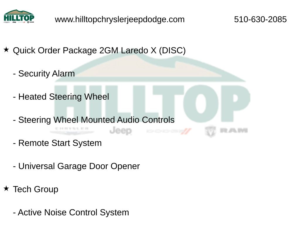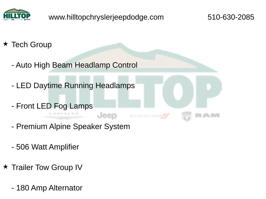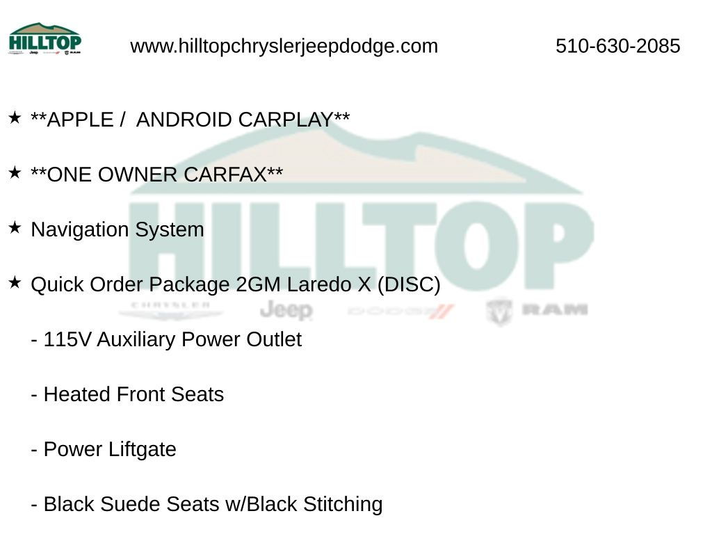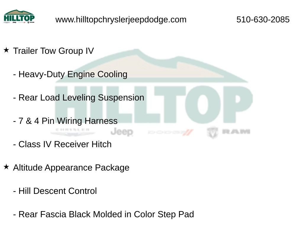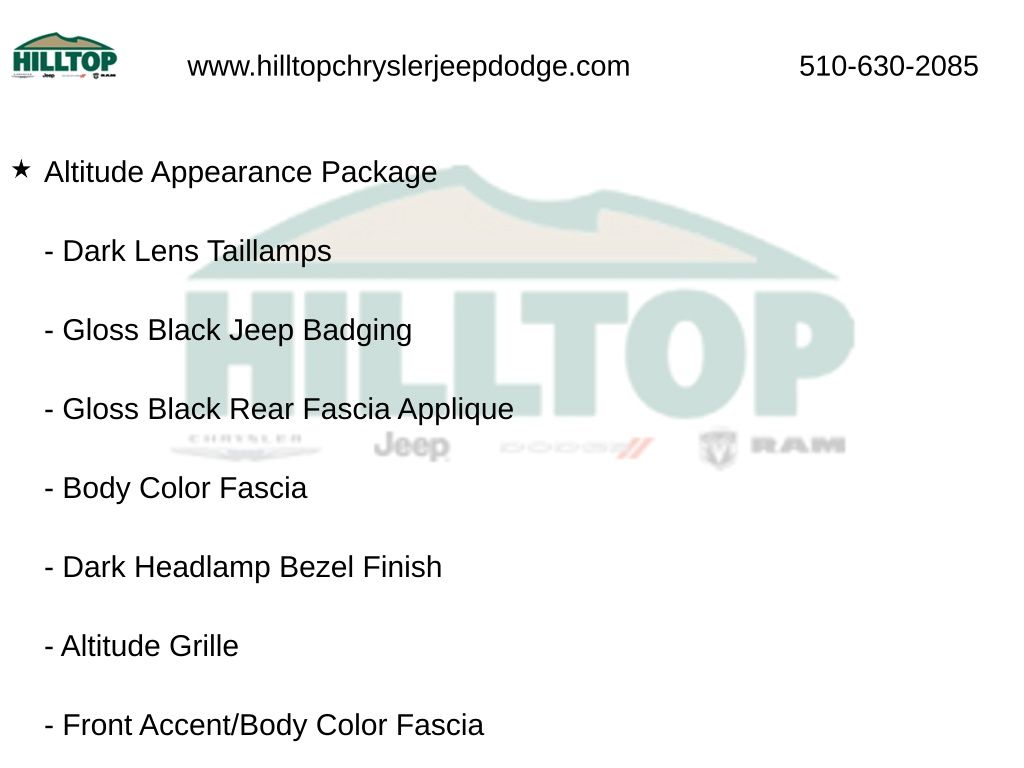 Hilltop CDJR makes buying or leasing your next car easy and enjoyable. Our CDJR finance team will spend time with you personally to discuss your preferences and budget, then help find loan rates that fit what you needâ"and negotiate the lease terms, too. We also offer extended warranty coverage and accessories that you can customize. We are your one-stop shop for buying or leasing cars in Richmond, CA. With our online car buying option you can browse the CDJR vehicles in stock, value your trade, apply for credit and estimate monthly payments all from your mobile deviceâ"or home computer. ****Vehicle Features May Include**** Altitude Appearance Package (Altitude Grille, Body Color Claddings, Body Color Fascia, Body Color Shark Fin Antenna, Dark Day Light Opening Moldings, Dark Headlamp Bezel Finish, Dark Lens Taillamps, Delete Laredo Badge, Front Accent/Body Color Fascia, Gloss Black Jeep Badging, Gloss Black Rear Fascia Applique, Hill Descent Control, Quadra-Trac II 4WD System, Rear Accent/Body Color Fascia, Rear Fascia Black Molded in Color Step Pad, Selec-Terrain System, Single Exhaust w/Bright Tip, and Wheels: 20" x 8.0" Gloss Black Aluminum), Protech II (Advanced Brake Assist, Auto High Beam Headlamp Control, Full Speed FWD Collision Warn
