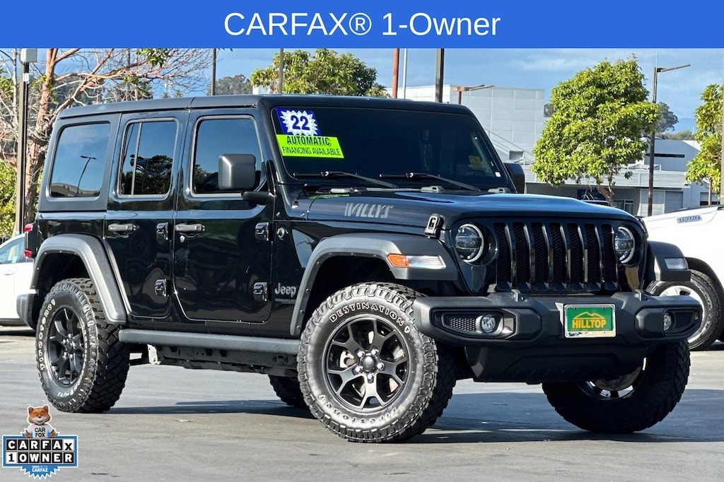 **ONE OWNER CARFAX**, VERY CLEAN CAR, 1-Year SiriusXM Guardian Trial, 110 MPH Vehicle Max Speed Calibration, 2-Door Passive Entry, Front Door Locks, 220 Amp Alternator, 3.45 Rear Axle Ratio, 4-Wheel Disc Brakes, 4-Wheel Drive Swing Gate Decal, 4G LTE Wi-Fi Hot Spot, 5-Year SiriusXM Traffic Service, 5-Year SiriusXM Travel Link Service, 8 Speakers, 8.4" Radio & Premium Audio Group, 8.4" Touchscreen Display, 97 MPH Vehicle Max Speed Calibration, ABS brakes, Air Conditioning, Air Conditioning w/Auto Temperature Control, Air Filtering, Alpine Premium Audio System, AM/FM radio, Anti-Spin Differential Rear Axle, Apple CarPlay/Android Auto, Auto-Dimming Rear-View Mirror, Automatic Headlamps, Aux Battery, Black 3-Piece Hard Top, Black Grille, Black Trail Rated Badge, Blind Spot & Cross Path Detection, Brake assist, Cloth Low-Back Bucket Seats, Cluster 7.0" TFT Color Display, Cold Weather Group, Compass, Convenience Group, Corning Gorilla Glass, Deep Tint Sunscreen Windows, Driver door bin, Driver vanity mirror, Dual front impact airbags, Dual front side impact airbags, Electronic Stability Control, Emergency communication system: SiriusXM Guardian, Emergency/Assistance Call, Engine Oil Cooler, Freedom Panel Storage Bag, Front 1-Touch Down Power Windows, Front anti-roll bar, Front Bucket Seats, Front Center Armrest w/Storage, Front LED Fog Lamps, Front reading lights, GPS Navigation, HD Radio, Heated Front Seats, Heated Steering Wheel, Injection Molded Black Rear Bumper, Integrated roll-over protection, Leather Wrapped Steering Wheel, LED Headlamp & Fog Lamp Group, LED Premium Reflector Headlamps, LED Taillamps, Low tire pressure warning, Matte Black Jeep Badge, Mold In Color Bumper w/Gloss Black, MOPAR All-Weather Floor Mats, MOPAR Doors Off Mirror Kit, MOPAR Grab Handle Kit, No Soft Top, Non-Lock Fuel Cap w/o Discriminator, Normal Duty Suspension, Occupant sensing airbag, Off-Road Info Pages, Outside temperature display, ParkSense Rear Park Assist System, ParkView Rear Back-Up Camera, Passenger door bin, Passenger vanity mirror, Power Heated Mirrors, Power steering, Quick Order Package 22W Willys, Radio data system, Radio: Uconnect 4 w/7" Display, Radio: Uconnect 4C Nav w/8.4" Display, Rear anti-roll bar, Rear reading lights, Rear Window Defroster, Rear Window Wiper/Washer, Remote Keyless Entry, Safety Group, Security Alarm, SiriusXM Radio Service, SiriusXM Satellite Radio, SiriusXM Traffic Plus, SiriusXM Travel Link, Speed control, Speed Sensitive Power Locks, Split folding rear seat, Steering wheel mounted audio controls, Stop-Start Dual Battery System, Sun Visors w/Illuminated Vanity Mirrors, Tachometer, Technology Group, Telescoping steering wheel, Tilt steering wheel, Traction control, Trip computer, Universal Garage Door Opener, Variably intermittent wipers, Wheels: 17" x 7.5" Black Steel Styled, Wheels: 17" x 7.5" Moab Black Aluminum, Willys, Willys Hood Decal.