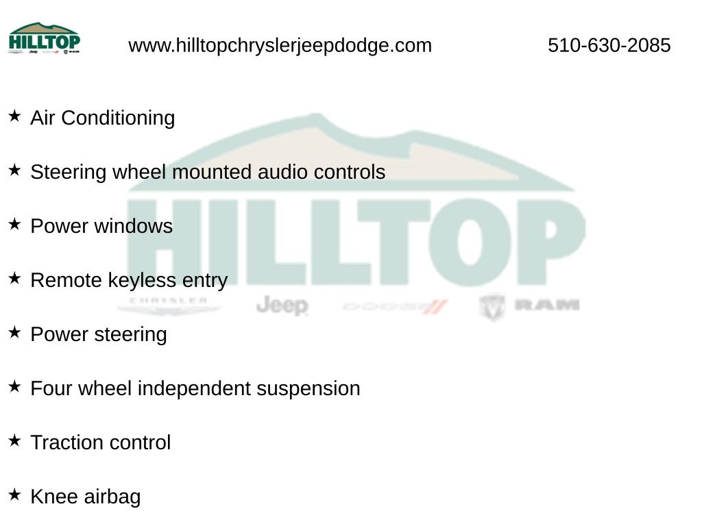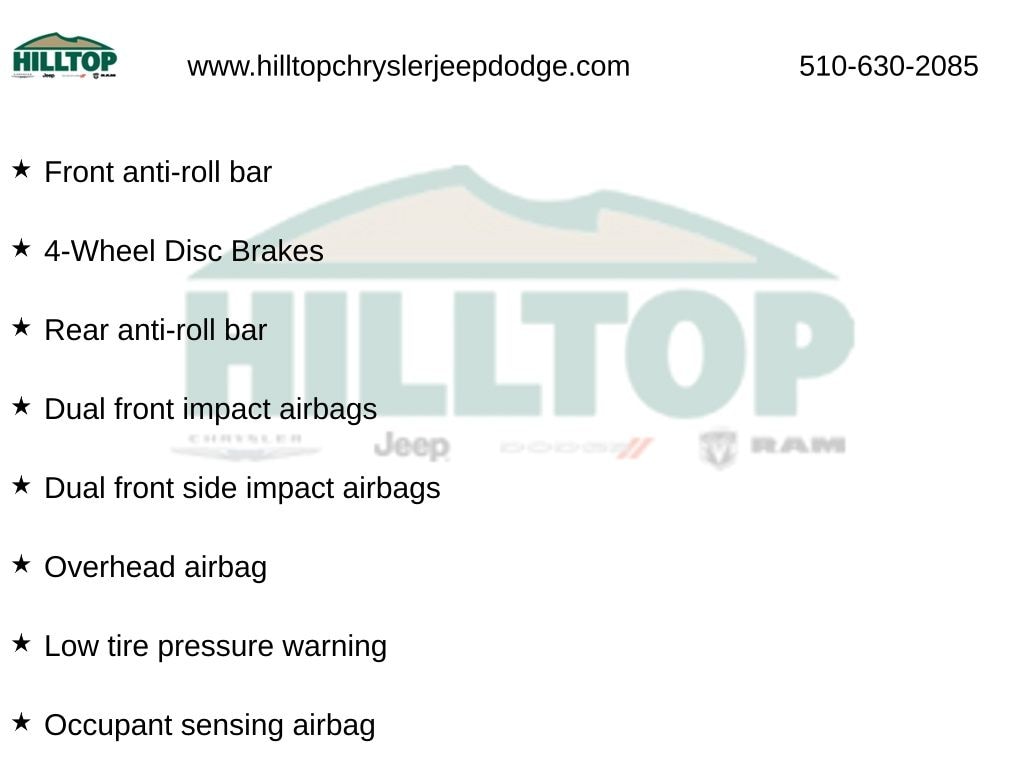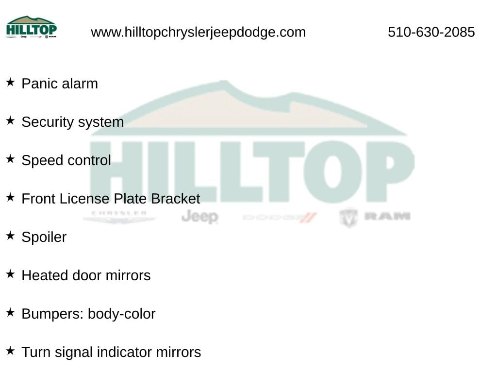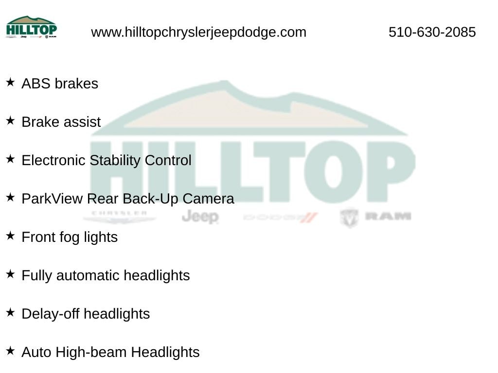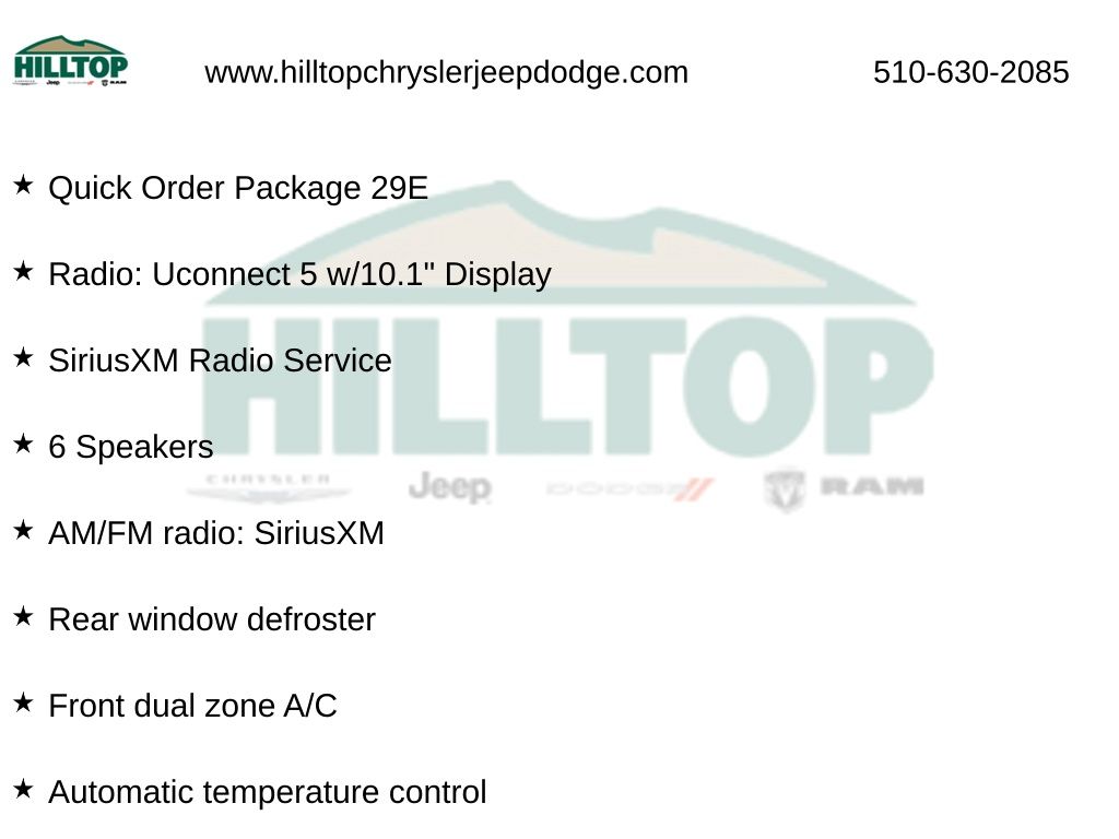 Hilltop CDJR makes buying or leasing your next car easy and enjoyable. Our CDJR finance team will spend time with you personally to discuss your preferences and budget, then help find loan rates that fit what you needâ"and negotiate the lease terms, too. We also offer extended warranty coverage and accessories that you can customize. We are your one-stop shop for buying or leasing cars in Richmond, CA. With our online car buying option you can browse the CDJR vehicles in stock, value your trade, apply for credit and estimate monthly payments all from your mobile deviceâ"or home computer. ****Vehicle Features May Include**** Quick Order Package 29E, 10.1" Touchscreen Display, 4-Wheel Disc Brakes, 6 Speakers, ABS brakes, Air Conditioning, Alloy wheels, AM/FM radio: SiriusXM, Auto High-beam Headlights, Auto-dimming Rear-View mirror, Automatic temperature control, Brake assist, Bumpers: body-color, Compass, Delay-off headlights, Disassociated Touchscreen Display, Driver door bin, Driver vanity mirror, Dual front impact airbags, Dual front side impact airbags, Electronic Stability Control, Four wheel independent suspension, Front anti-roll bar, Front Bucket Seats, Front Center Armrest w/Storage, Front dual zone A/C, Front fog lights, Front License Plate Bracket, Front reading lights, Fully automatic headlights, Heated door mirrors, Illuminated entry, Knee airbag, Leather Shift Knob, Low tire pressure warning, Occupant sensing airbag, Outside temperature display, Overhead airbag, Overhead console, Panic alarm, ParkView Rear Back-Up Camera, Passenger door bin, Passenger vanity mirror, Power door mirrors, Power steering, Power windows, Premium Cloth/Leather Trim Bucket Seats, Radio: Uconnect 5 w/10.1" Display, Rain sensing wipers, Rear anti-roll bar, Rear seat center armrest, Rear window defroster, Remote keyless entry, Security system, SiriusXM Radio Service, Speed control, Split folding rear seat, Spoiler, Steering wheel mounted audio controls, Tachometer, Telescoping steering wheel, Tilt steering wheel, Traction control, Trip computer, Turn signal indicator mirrors, Wheels: 17" x 6.5" Painted Black Aluminum, 4.398 Final Drive Ratio, Rear window wiper,
