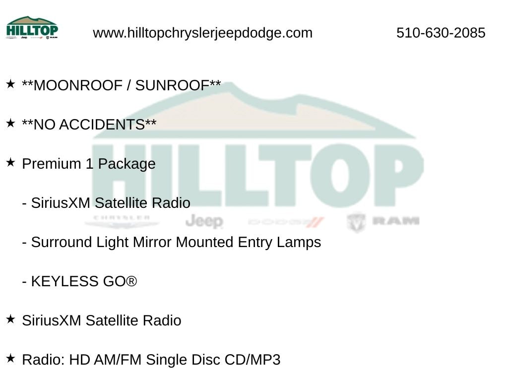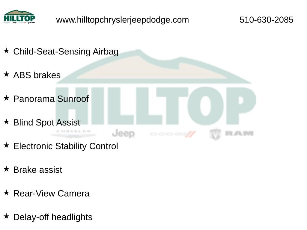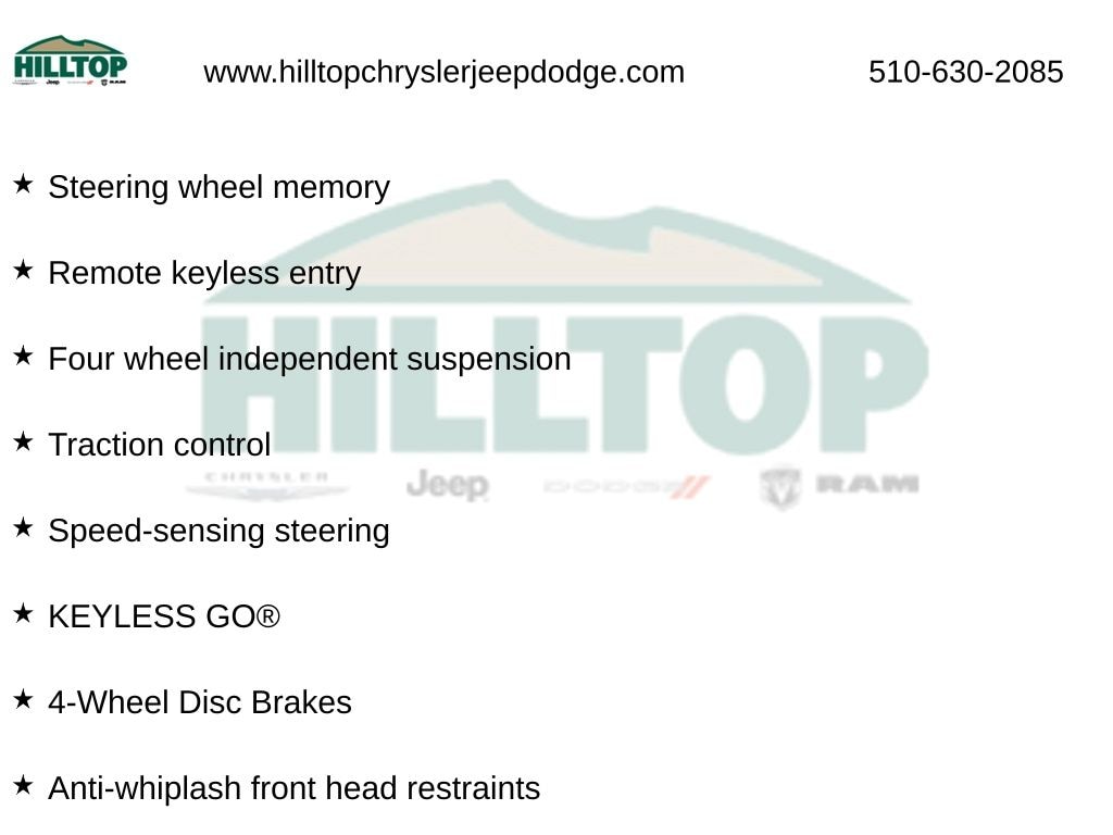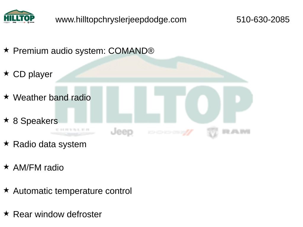 Hilltop CDJR makes buying or leasing your next car easy and enjoyable. Our CDJR finance team will spend time with you personally to discuss your preferences and budget, then help find loan rates that fit what you needâ"and negotiate the lease terms, too. We also offer extended warranty coverage and accessories that you can customize. We are your one-stop shop for buying or leasing cars in Richmond, CA. With our online car buying option you can browse the CDJR vehicles in stock, value your trade, apply for credit and estimate monthly payments all from your mobile deviceâ"or home computer. ****Vehicle Features May Include**** Premium 1 Package (KEYLESS GO®, SiriusXM Satellite Radio, and Surround Light Mirror Mounted Entry Lamps), 4-Wheel Disc Brakes, 8 Speakers, ABS brakes, Air Conditioning, Alloy wheels, AM/FM radio, Anti-whiplash front head restraints, Auto tilt-away steering wheel, Auto-dimming door mirrors, Auto-dimming Rear-View mirror, Automatic temperature control, Blind Spot Assist, Brake assist, Bumpers: body-color, CD player, Child-Seat-Sensing Airbag, Compass, Delay-off headlights, Driver door bin, Driver vanity mirror, Electronic Stability Control, Four wheel independent suspension, Front Bucket Seats, Front Center Armrest, Front dual zone A/C, Front reading lights, Fully automatic headlights, Garage door transmitter: Homelink, Head restraints memory, Heated door mirrors, Heated Front Seats, Illuminated entry, MB-Tex Upholstery, Memory seat, Outside temperature display, Overhead console, Panic alarm, Panorama Sunroof, Passenger door bin, Passenger vanity mirror, Power door mirrors, Power driver seat, Power passenger seat, Power steering, Power windows, Premium audio system: COMAND®, Radio data system, Radio: HD AM/FM Single Disc CD/MP3, Rear fog lights, Rear reading lights, Rear seat center armrest, Rear Trunk Lid Spoiler, Rear window defroster, Rear-View Camera, Remote keyless entry, Security system, Speed control, Speed-sensing steering, Split folding rear seat, Steering wheel memory, Steering wheel mounted audi