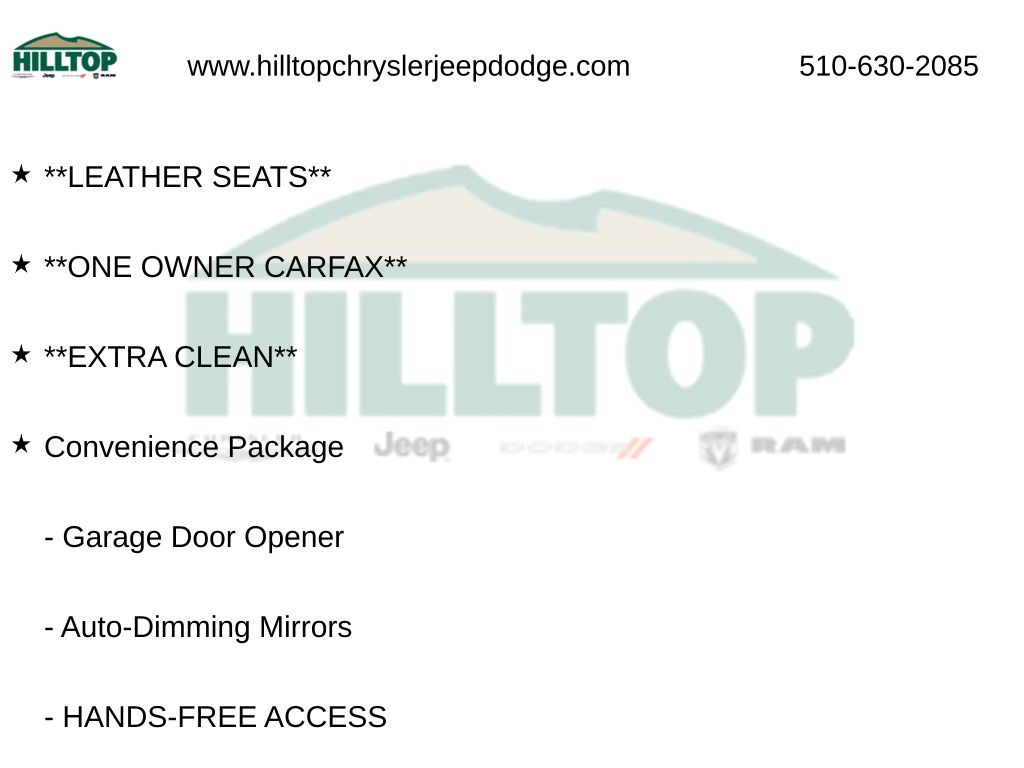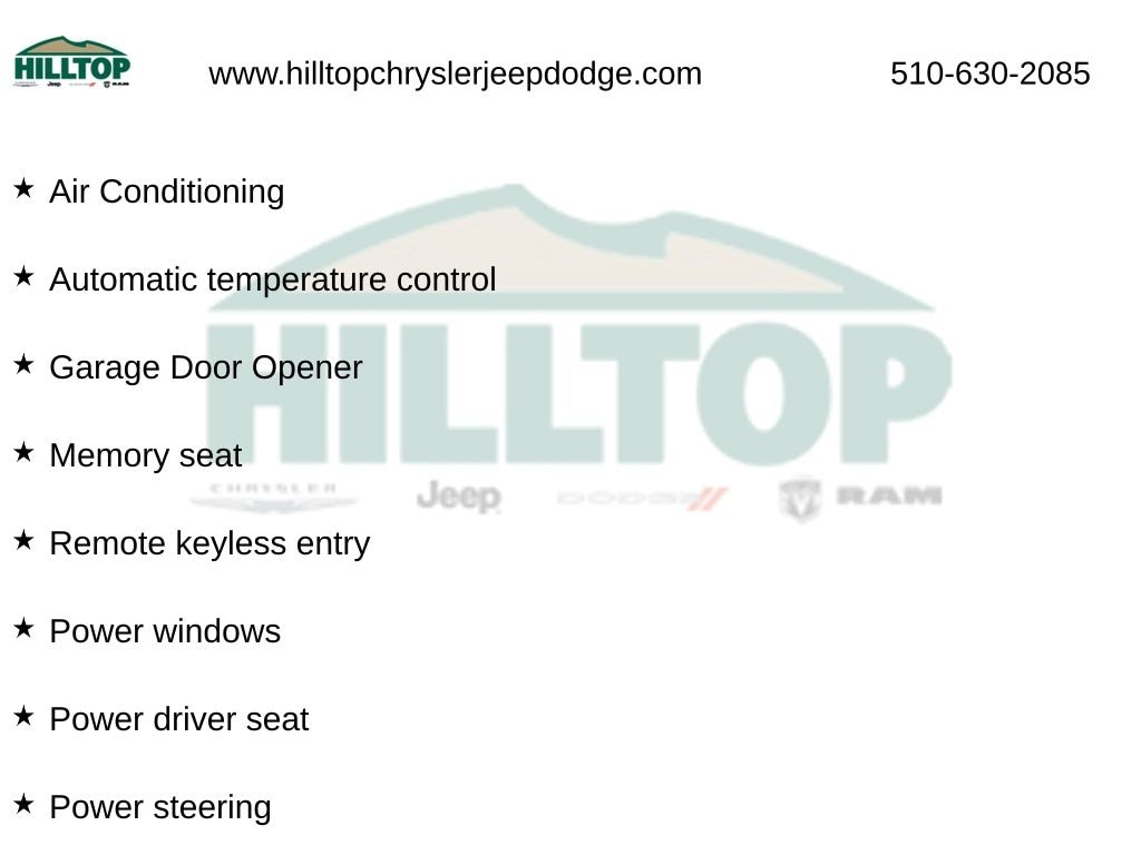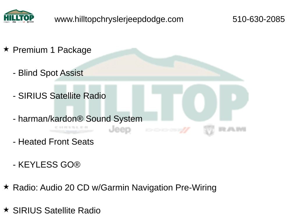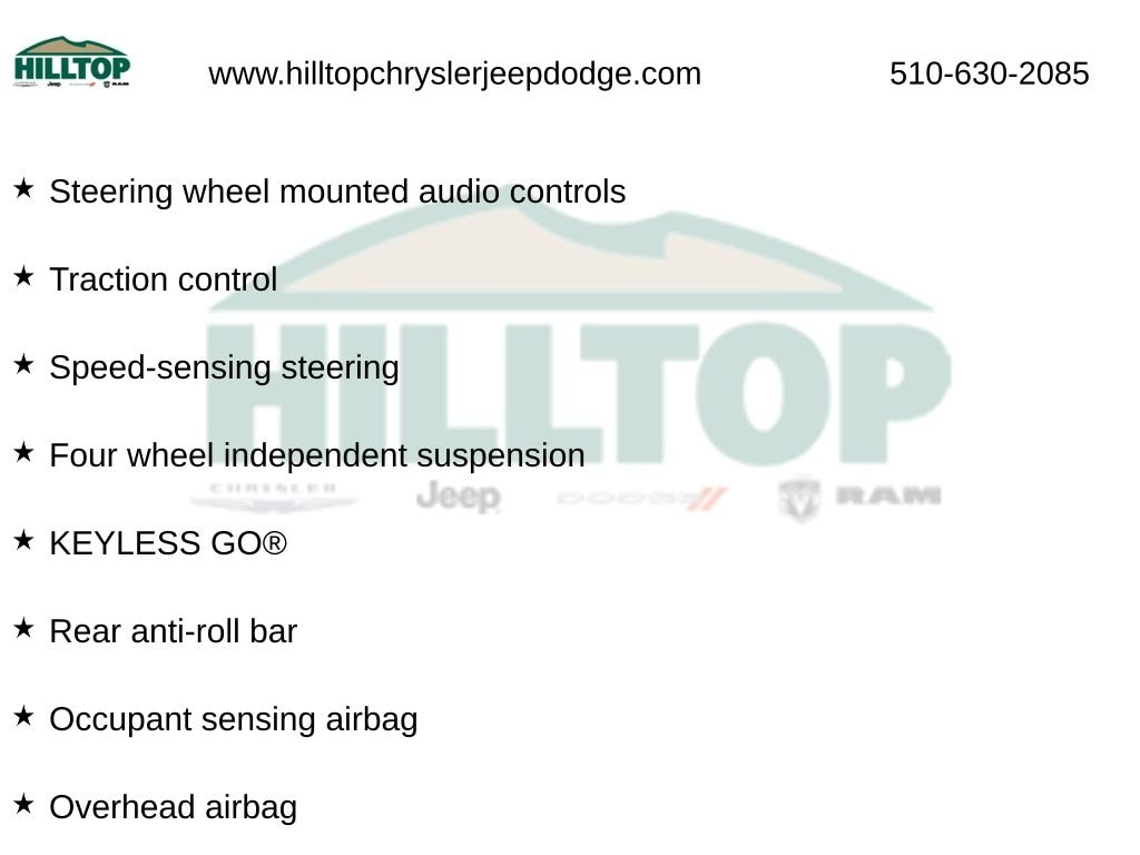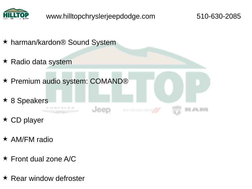 Hilltop CDJR makes buying or leasing your next car easy and enjoyable. Our CDJR finance team will spend time with you personally to discuss your preferences and budget, then help find loan rates that fit what you needâ"and negotiate the lease terms, too. We also offer extended warranty coverage and accessories that you can customize. We are your one-stop shop for buying or leasing cars in Richmond, CA. With our online car buying option you can browse the CDJR vehicles in stock, value your trade, apply for credit and estimate monthly payments all from your mobile deviceâ"or home computer. ****Vehicle Features May Include**** Convenience Package (Auto-Dimming Mirrors, Garage Door Opener, and HANDS-FREE ACCESS), Premium 1 Package (Blind Spot Assist, harman/kardon® Sound System, Heated Front Seats, KEYLESS GO®, and SIRIUS Satellite Radio), 4-Wheel Disc Brakes, 8 Speakers, 8" Color Display Upgrade, ABS brakes, Air Conditioning, Alloy wheels, AM/FM radio, AMG® Performance Exhaust, AMG® Sport Suspension, Android Auto®, Apple CarPlay®, Automatic temperature control, Brake assist, Bumpers: body-color, CD player, Child-Seat-Sensing Airbag, Compass, Delay-off headlights, Deletion of Red Seatbelts to Black, Driver door bin, Driver vanity mirror, Dual front impact airbags, Dual front side impact airbags, Electronic St