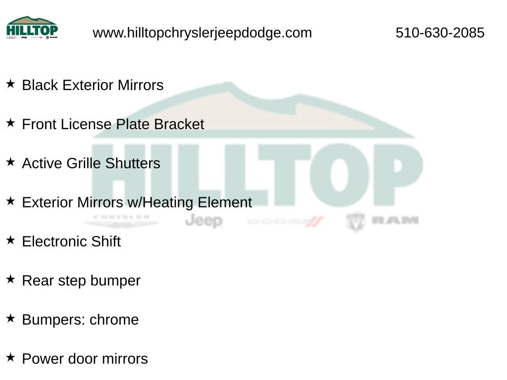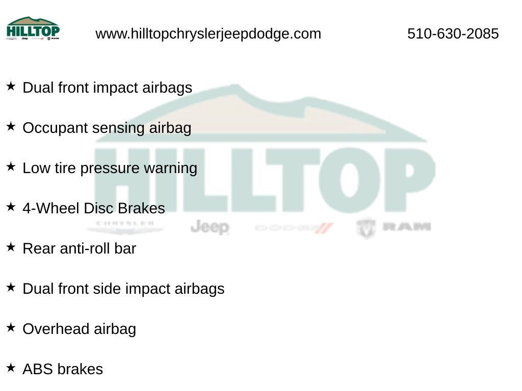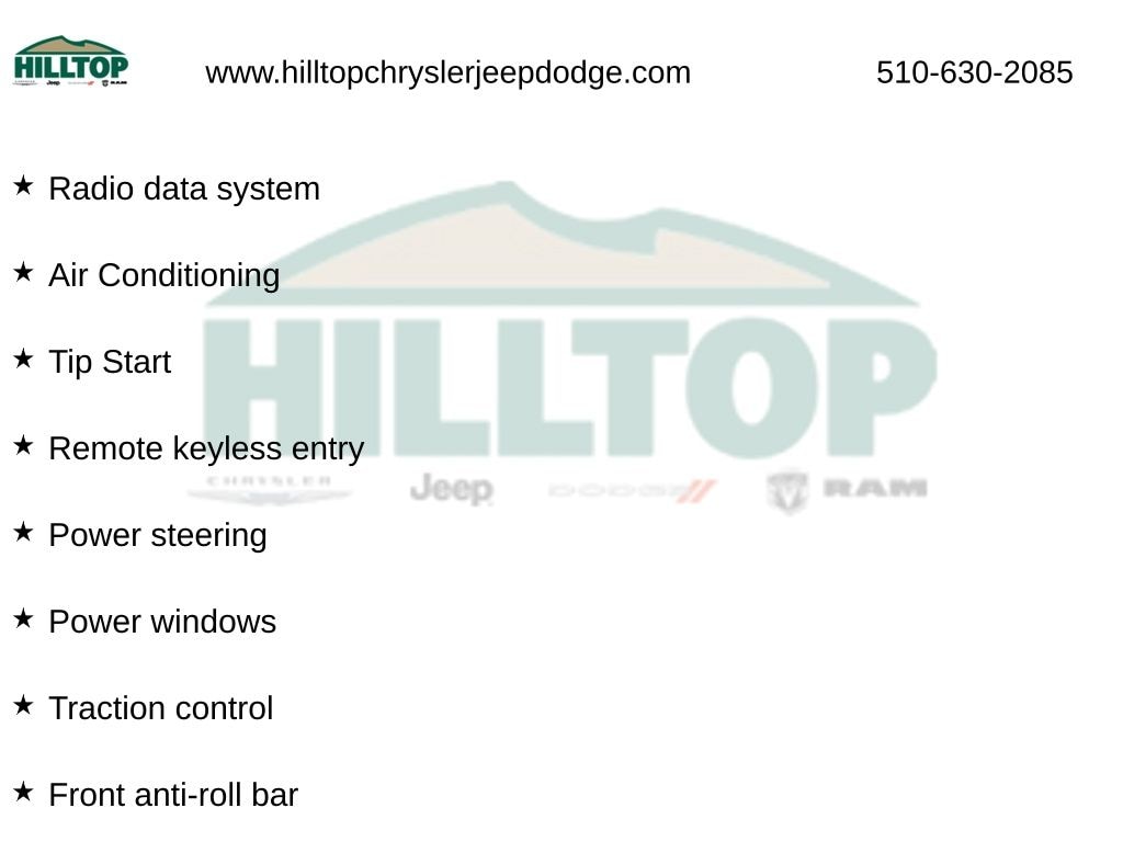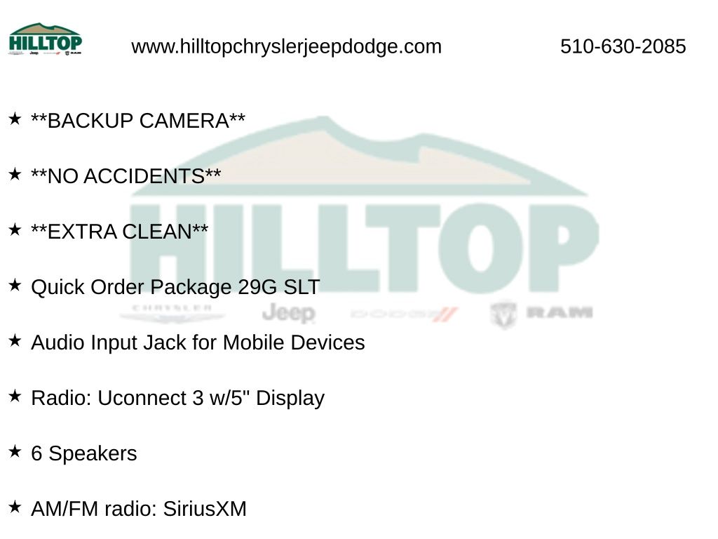 Hilltop CDJR makes buying or leasing your next car easy and enjoyable. Our CDJR finance team will spend time with you personally to discuss your preferences and budget, then help find loan rates that fit what you needâ"and negotiate the lease terms, too. We also offer extended warranty coverage and accessories that you can customize. We are your one-stop shop for buying or leasing cars in Richmond, CA. With our online car buying option you can browse the CDJR vehicles in stock, value your trade, apply for credit and estimate monthly payments all from your mobile deviceâ"or home computer. ****Vehicle Features May Include**** Quick Order Package 29G SLT, 17" x 7" Aluminum Wheels, 3.21 Rear Axle Ratio, 4-Wheel Disc Brakes, 40/20/40 Split Bench Seat, 6 Speakers, ABS brakes, Active Grille Shutters, Air Conditioning, Alloy wheels, AM/FM radio: SiriusXM, Audio Input Jack for Mobile Devices, Black Exterior Mirrors, Brake assist, Bumpers: chrome, Center Hub, Charge Only Remote USB Port, Cloth 40/20/40 Bench Seat, Compass, Delay-off headlights, Driver door bin, Dual front impact airbags, Dual front side impact airbags, Electronic Shift, Electronic Stability Control, Exterior Mirrors w/Heating Element, Front anti-roll bar, Front Armrest w/3 Cupholders, Front Center Armrest w/Storage, Front License Plate Bracket, Front reading lights, Front wheel independent suspension, Fully automatic headlights, GPS Antenna Input, Heated door mirrors, Illuminated entry, Integrated Voice Command w/Bluetooth, Low tire pressure warning, Manufacturer's Statement of Origin, Occupant sensing airbag, Outside temperature display, Overhead airbag, Overhead console, Panic alarm, ParkView Rear Back-Up Camera, Passenger door bin, Passenger vanity mirror, Power door mirrors, Power steering, Power windows, Radio data system, Radio: Uconnect 3 w/5" Display, Rear anti-roll bar, Rear step bumper, Remote keyless entry, Remote USB Port, Speed control, Tachometer, Tilt steering wheel, Tip Start, Traction control, Trip computer, Variably intermittent wipers, and Voltmeter.