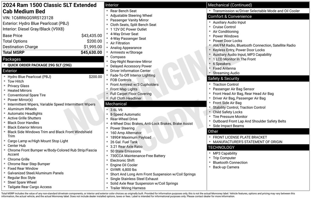 2024 Ram 1500 Classic Hydro Blue Pearlcoat SLT RWD 8-Speed Automatic 3.6L V6 24V VVT
