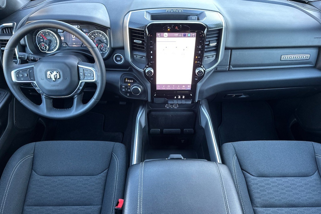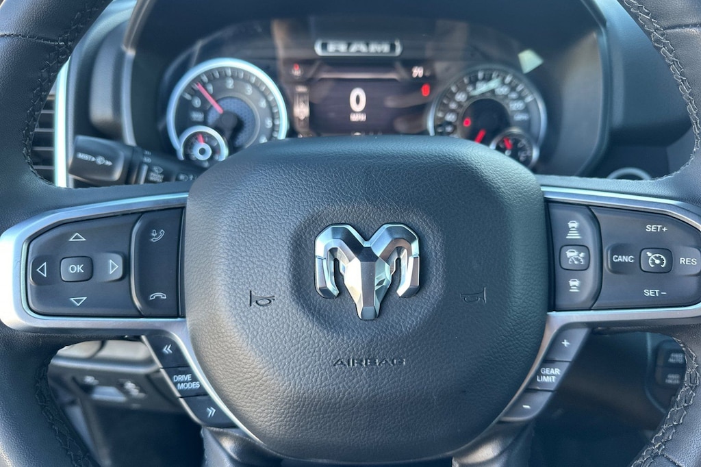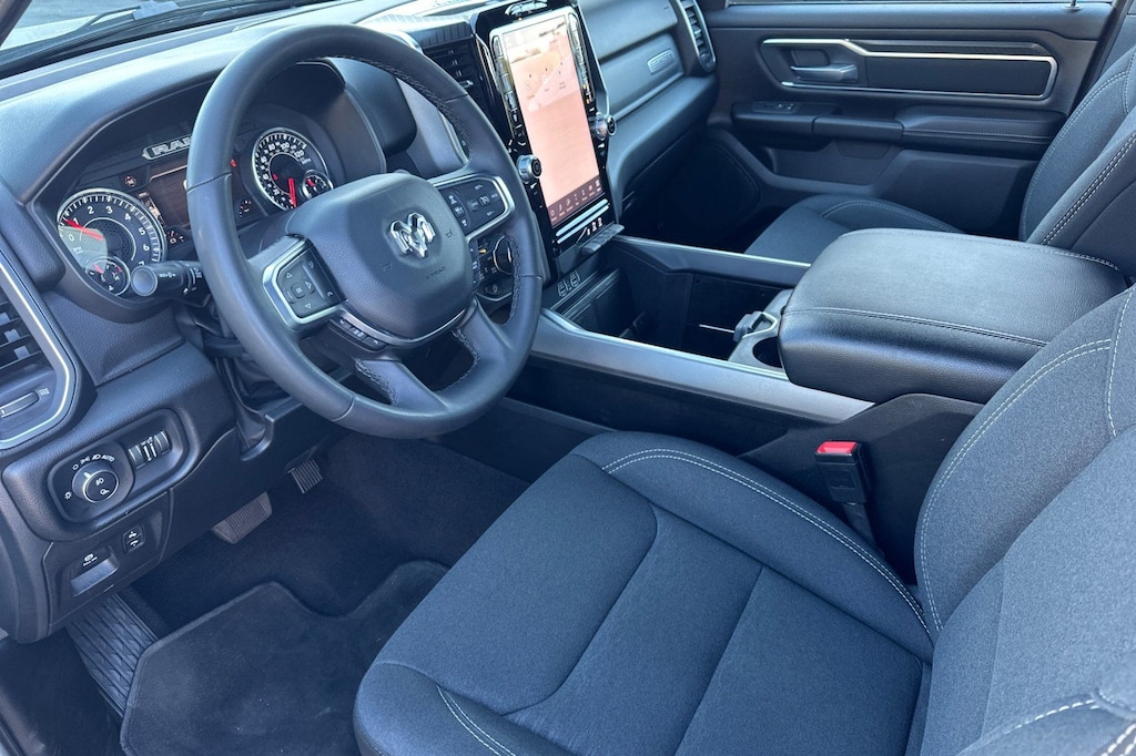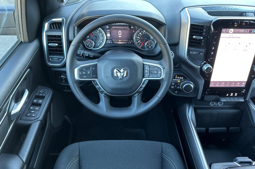 Slip behind the wheel and experience the luxurious cabin, complete with deluxe cloth bucket seats, a power-adjustable driver's seat, and a leather-wrapped steering wheel. The spacious interior and versatile storage solutions make this Ram 1500 the perfect companion for work, play, and everything in between.