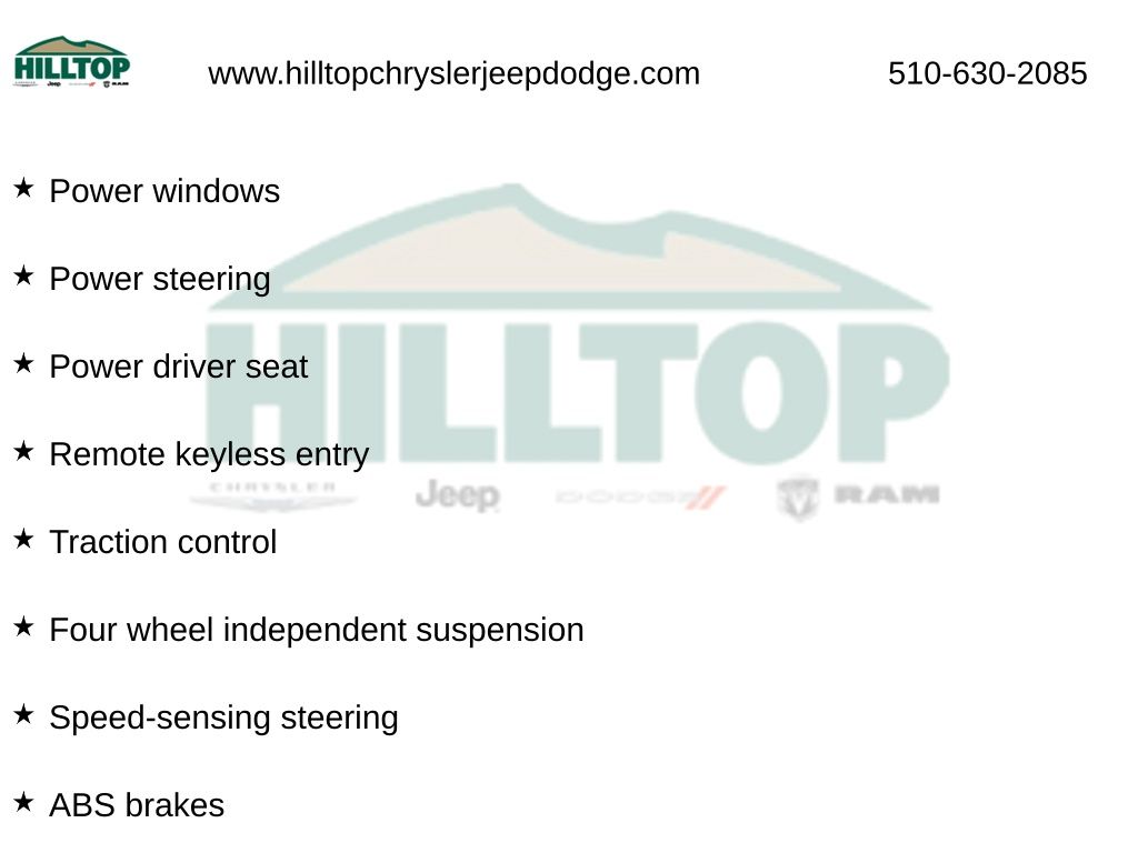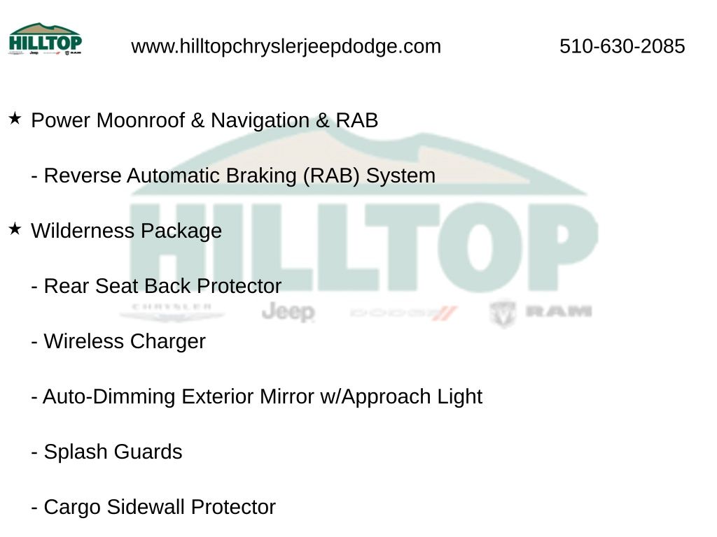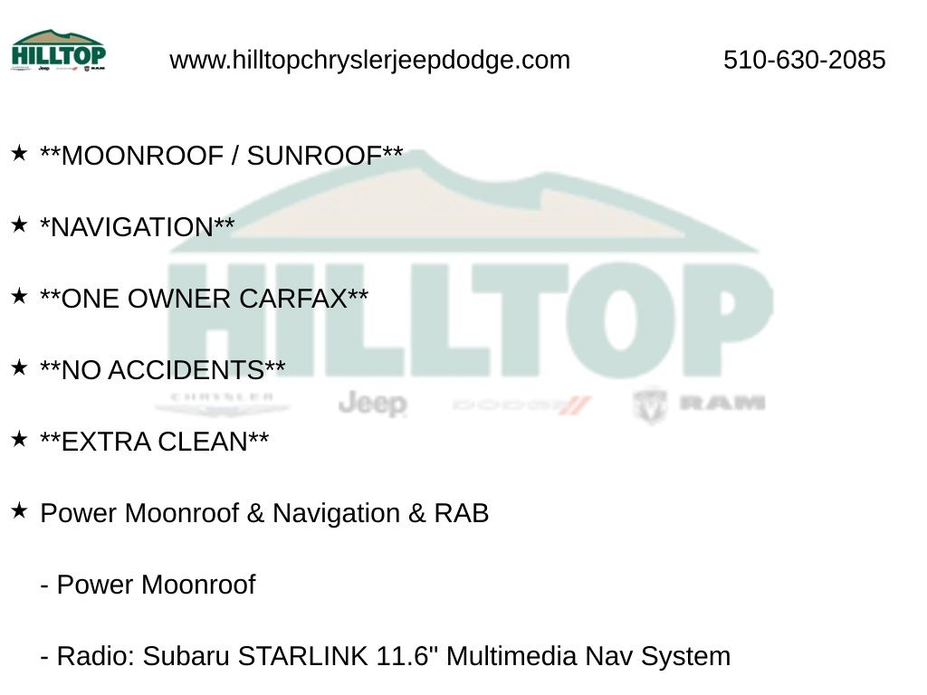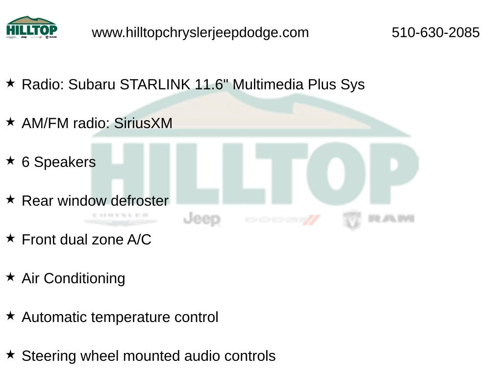 Hilltop CDJR makes buying or leasing your next car easy and enjoyable. Our CDJR finance team will spend time with you personally to discuss your preferences and budget, then help find loan rates that fit what you needâ"and negotiate the lease terms, too. We also offer extended warranty coverage and accessories that you can customize. We are your one-stop shop for buying or leasing cars in Richmond, CA. With our online car buying option you can browse the CDJR vehicles in stock, value your trade, apply for credit and estimate monthly payments all from your mobile deviceâ"or home computer. ****Vehicle Features May Include**** Power Moonroof & Navigation & RAB (Power Moonroof, Radio: Subaru STARLINK 11.6" Multimedia Nav System, and Reverse Automatic Braking (RAB) System), Wilderness Package (Auto-Dimming Exterior Mirror w/Approach Light, Cargo Sidewall Protector, Rear Seat Back Protector, Splash Guards, and Wireless Charger), 4-Wheel Disc Brakes, 4.444 Axle Ratio, 6 Speakers, ABS brakes, Air Conditioning, Alloy wheels, AM/FM radio: SiriusXM, Auto High-beam Headlights, Auto-dimming Rear-View mirror, Automatic temperature control, Brake assist, Carpeted Floor Mats, Compass, Driver door bin, Dual front impact airbags, Dual front side impact airbags, Electronic Stability Control, Emergency communication system: STARLINK Safety Plus (3-year free trial), Exterior Parking Camera Rear, Four wheel independent suspension, Front anti-roll bar, Front Bucket Seats, Front Center Armrest w/Storage, Front dual zone A/C, Front fog lights, Fully automatic headlights, Heated door mirrors, Heated Front Bucket Seats, Heated front seats, Heated rear seats, Knee airbag, Leather steering wheel, Low tire pressure warning, Occupant sensing