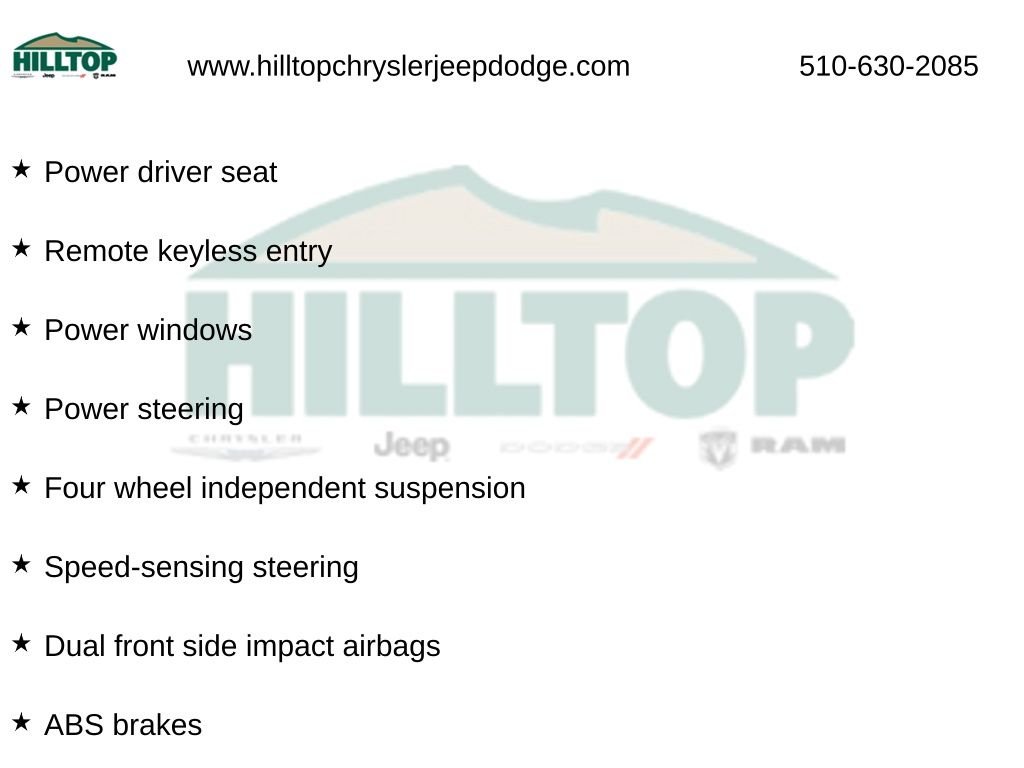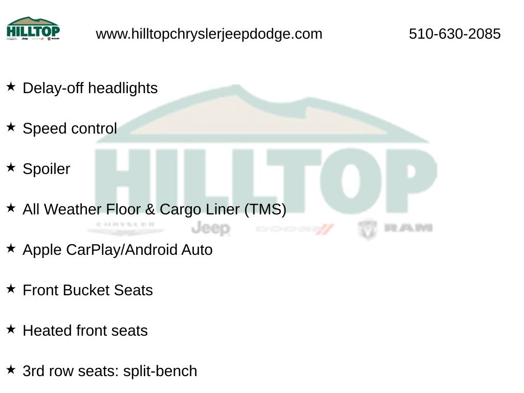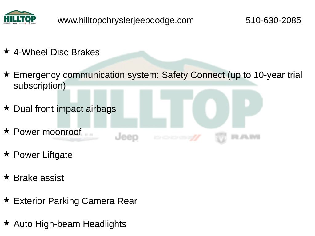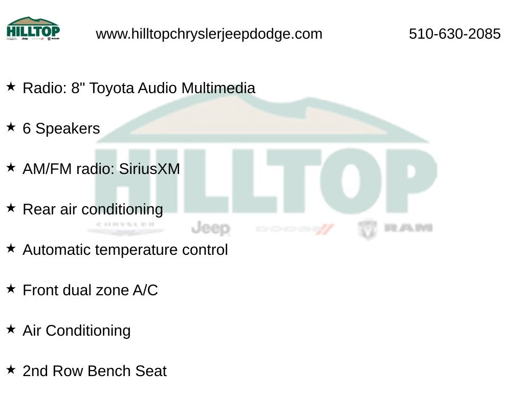 Hilltop CDJR makes buying or leasing your next car easy and enjoyable. Our CDJR finance team will spend time with you personally to discuss your preferences and budget, then help find loan rates that fit what you needâ"and negotiate the lease terms, too. We also offer extended warranty coverage and accessories that you can customize. We are your one-stop shop for buying or leasing cars in Richmond, CA. With our online car buying option you can browse the CDJR vehicles in stock, value your trade, apply for credit and estimate monthly payments all from your mobile deviceâ"or home computer. ****Vehicle Features May Include**** 2nd Row Bench Seat, 3rd row seats: split-bench, 4-Wheel Disc Brakes, 6 Speakers, ABS brakes, Air Conditioning, All Weather Floor & Cargo Liner (TMS), Alloy wheels, AM/FM radio: SiriusXM, Apple CarPlay/Android Auto, Auto High-beam Headlights, Automatic temperature control, Brake assist, Delay-off headlights, Dual front impact airbags, Dual front side impact airbags, Emergency communication system: Safety Connect (up to 10-year trial subscription), Exterior Parking Camera Rear, Four wheel independent suspension, Front Bucket Seats, Front dual zone A/C, Heated front seats, Power driver seat, Power Liftgate, Power moonroof, Power steering, Power windows, Radio: 12.3" Toyota Audio Multimedia w/6 Speakers, Radio: 8" Toyota Audio Multimedia, Rear air conditioning, Reclining 3rd row seat, Remote keyless entry, Speed control, Speed-sensing steering, Spoiler, Wheels: 18" Machined-Finish Alloy, 3.329 Axle Ratio, Auto-dimming Rear-View mirror, Bumpers: body-color, Cargo Cross Bars (TMS), Clear Rear Bumper Applique (TMS), Driver door bin, Driver vanity mirror, Electronic Stability Control, Front anti-roll bar, Front Center Armrest, Front fog lights, Front reading lights, Fully automatic headlights, Garage door transmitter: HomeLink, Heated door mirrors, Heated Front Bucket Seats, Illuminated entry, Knee airbag, Leather Shift Knob, Leather steering wheel, Low tire pressure warning, Occupant sensing airbag, Outside temperature display, Overhead airbag, Overhead console, Panic alarm, Passenger door bin, Passenger vanity mirror, Power door mirrors, Power passenger seat, Rear anti-roll bar, Rear reading lights, Rear window defroster, Rear window wiper, Security system, SofTex Seat Trim, Split folding rear seat, Steering wheel mounted audio controls, Tachometer, Telescoping steering wheel, Tilt steering wheel, Traction control, Trip computer, Turn signal indicator mirrors, and Variably intermittent wipers.
