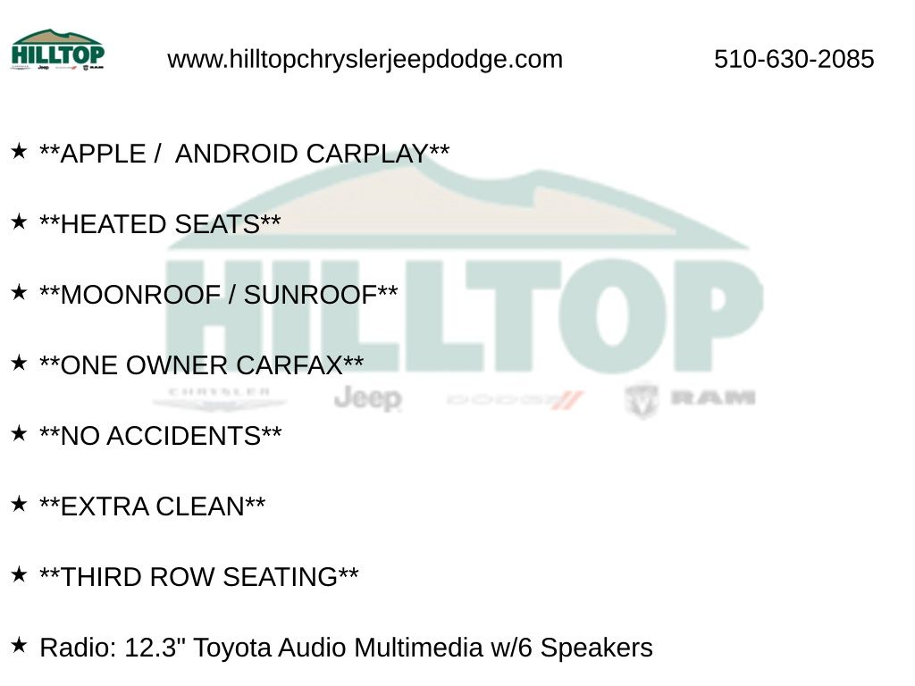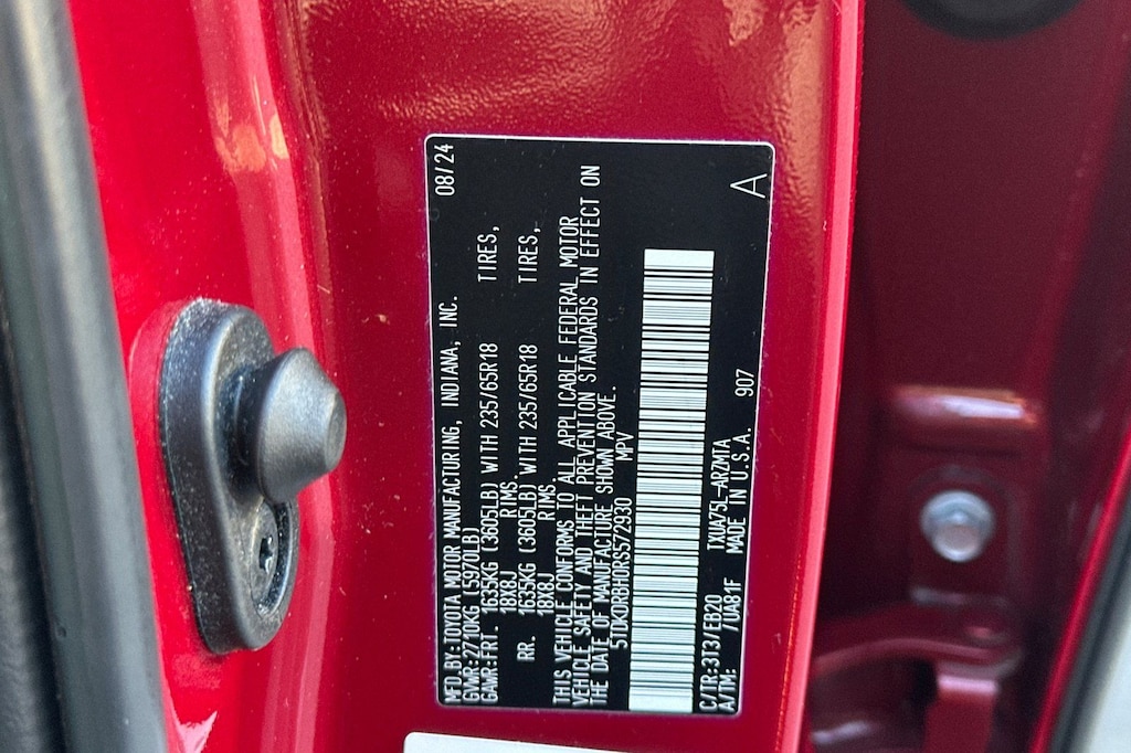 **APPLE / ANDROID CARPLAY**, **HEATED SEATS**, **MOONROOF / SUNROOF**, **ONE OWNER CARFAX**, **NO ACCIDENTS**, **EXTRA CLEAN**, **THIRD ROW SEATING**, 2nd Row Bench Seat, 3rd row seats: split-bench, 4-Wheel Disc Brakes, 6 Speakers, ABS brakes, Air Conditioning, All Weather Floor & Cargo Liner (TMS), Alloy wheels, AM/FM radio: SiriusXM, Apple CarPlay/Android Auto, Auto High-beam Headlights, Auto-dimming Rear-View mirror, Automatic temperature control, Brake assist, Bumpers: body-color, Cargo Cross Bars (TMS), Clear Rear Bumper Applique (TMS), Delay-off headlights, Driver door bin, Driver vanity mirror, Dual front impact airbags, Dual front side impact airbags, Electronic Stability Control, Emergency communication system: Safety Connect (up to 10-year trial subscription), Exterior Parking Camera Rear, Four wheel independent suspension, Front anti-roll bar, Front Bucket Seats, Front Center Armrest, Front dual zone A/C, Front fog lights, Front reading lights, Fully automatic headlights, Garage door transmitter: HomeLink, Heated door mirrors, Heated Front Bucket Seats, Heated front seats, Illuminated Door Sills (TMS), Knee airbag, Low tire pressure warning, Occupant sensing airbag, Overhead airbag, Panic alarm, Passenger door bin, Power door mirrors, Power driver seat, Power Liftgate, Power moonroof, Power passenger seat, Power steering, Power windows, Radio: 12.3" Toyota Audio Multimedia w/6 Speakers, Radio: 8" Toyota Audio Multimedia, Rear air conditioning, Rear anti-roll bar, Rear window defroster, Reclining 3rd row seat, Remote keyless entry, Security system, SofTex Seat Trim, Speed control, Speed-sensing steering, Split folding rear seat, Spoiler, Steering wheel mounted audio controls, Tachometer, Telescoping steering wheel, Traction control, Turn signal indicator mirrors, Wheels: 18" Machined-Finish Alloy.