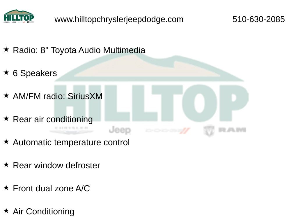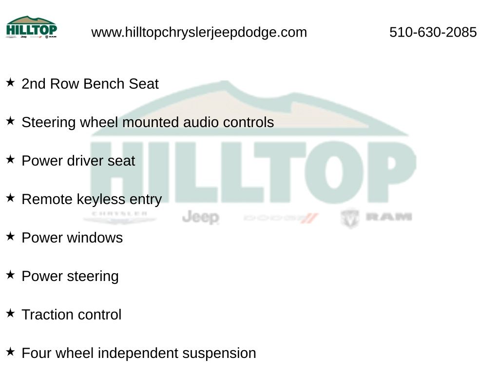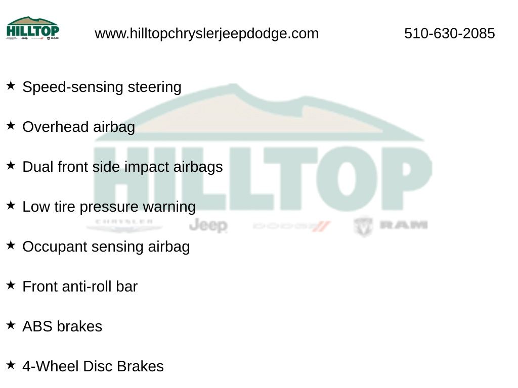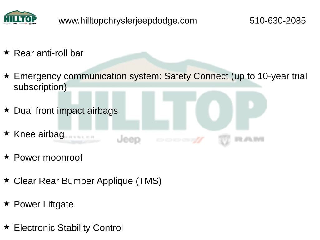 Hilltop CDJR makes buying or leasing your next car easy and enjoyable. Our CDJR finance team will spend time with you personally to discuss your preferences and budget, then help find loan rates that fit what you needâ"and negotiate the lease terms, too. We also offer extended warranty coverage and accessories that you can customize. We are your one-stop shop for buying or leasing cars in Richmond, CA. With our online car buying option you can browse the CDJR vehicles in stock, value your trade, apply for credit and estimate monthly payments all from your mobile deviceâ"or home computer. ****Vehicle Features May Include**** 2nd Row Bench Seat, 3rd row seats: split-bench, 4-Wheel Disc Brakes, 6 Speakers, ABS brakes, Air Conditioning, All Weather Floor & Cargo Liner (TMS), Alloy wheels, AM/FM radio: SiriusXM, Apple CarPlay/Android Auto, Auto High-beam Headlights, Auto-dimming Rear-View mirror, Automatic temperature control, Brake assist, Bumpers: body-color, Cargo Cross Bars (TMS), Clear Rear Bumper Applique (TMS), Delay-off headlights, Driver door bin, Driver vanity mirror, Dual front impact airbags, Dual front side impact airbags, Electronic Stability Control, Emergency communication system: Safety Connect (up to 10-year trial subscription), Exterior Parking Camera Rear, Four wheel independent suspension, Front anti-roll bar, Front Bucket Seats, Front Center Armrest, Front dual zone A/C, Front fog lights, Front reading lights, Fully automatic headlights, Garage door transmitter: HomeLink, Heated door mirrors, Heated Front Bucket Seats, Heated front seats, Illuminated Door Sills (TMS), Knee airbag, Low tire pressure warning, Occupant sensing airbag, Overhead airbag, Panic alarm, Passenger door bin, Power door mirrors, Power driver seat, Power Liftg